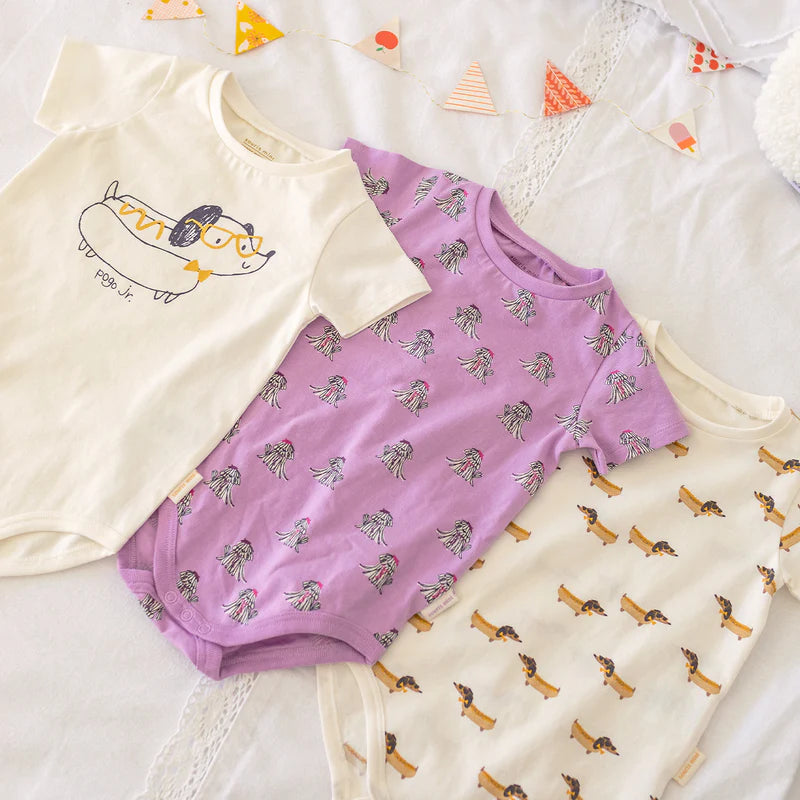 Cache-couche crème avec une illustration d’un mignon chien saucisse. Comprend un col rond, des manches courtes et des boutons-pression à l’entrejambe pour faciliter l’habillage. Fabriqué en jersey de coton pour un maximum de confort.
