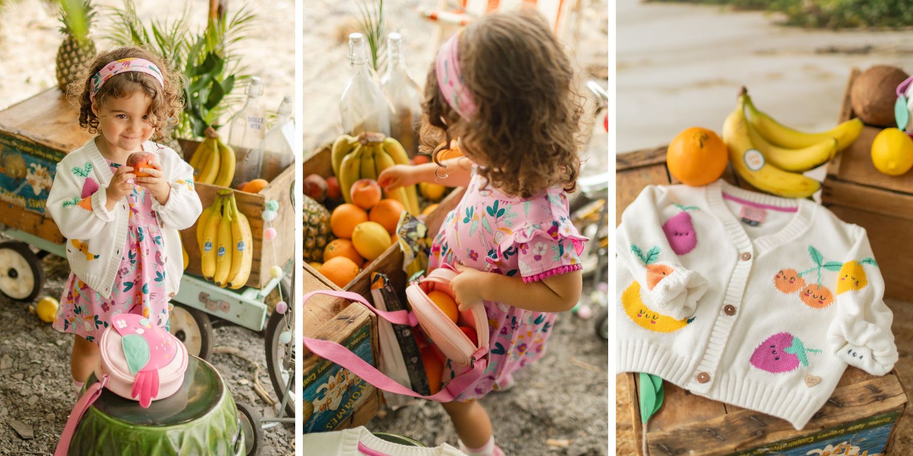 Par ici l'évasion! Robes légères aux imprimés tropicaux, t-shirts amusants, cardigans fruités et petits accessoires colorés s’unissent pour créer des looks joyeux et ensoleillés. Entre teintes lumineuses et motifs de fruits, cette collection apporte fraîcheur et bonne humeur au quotidien.