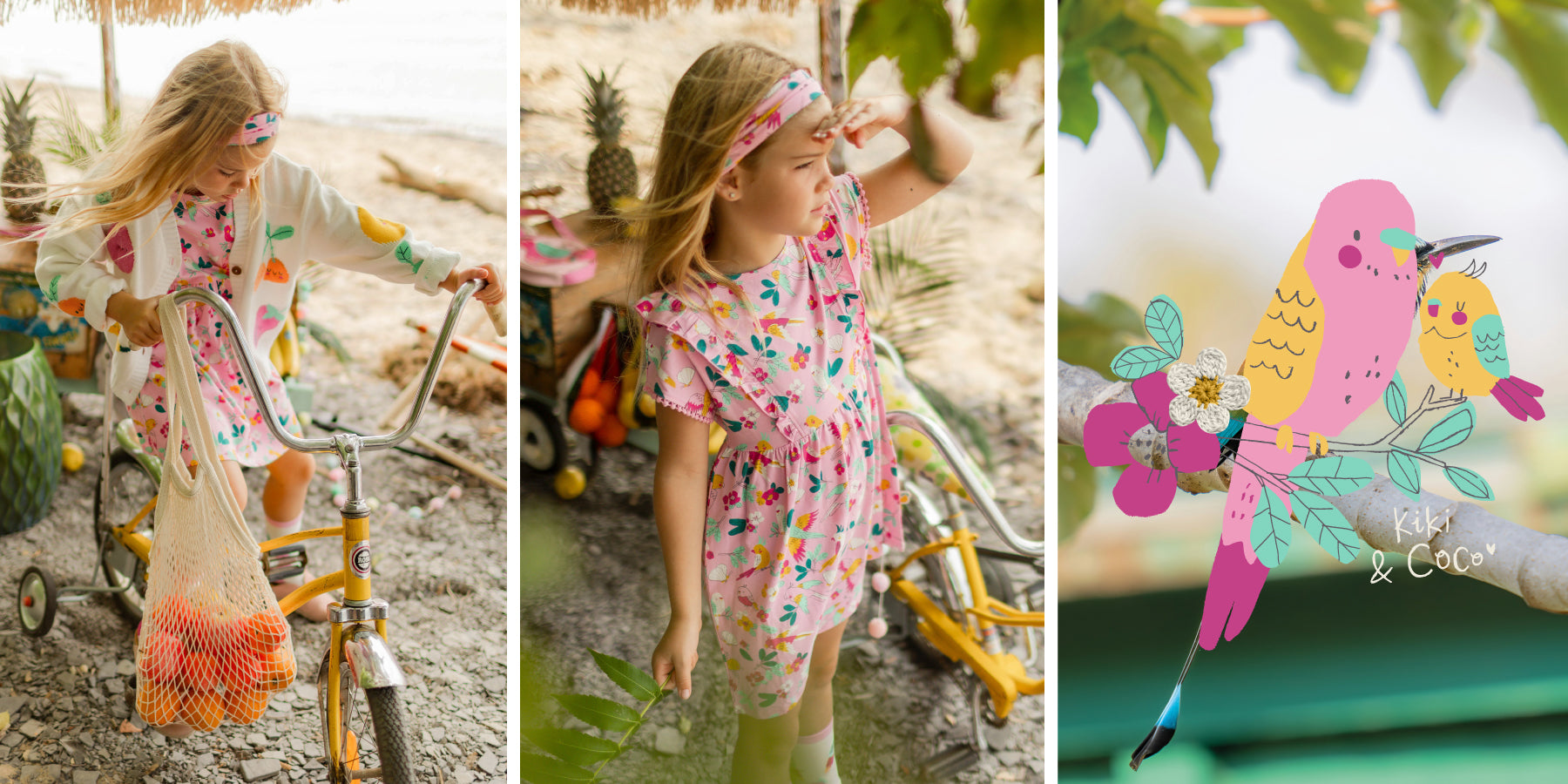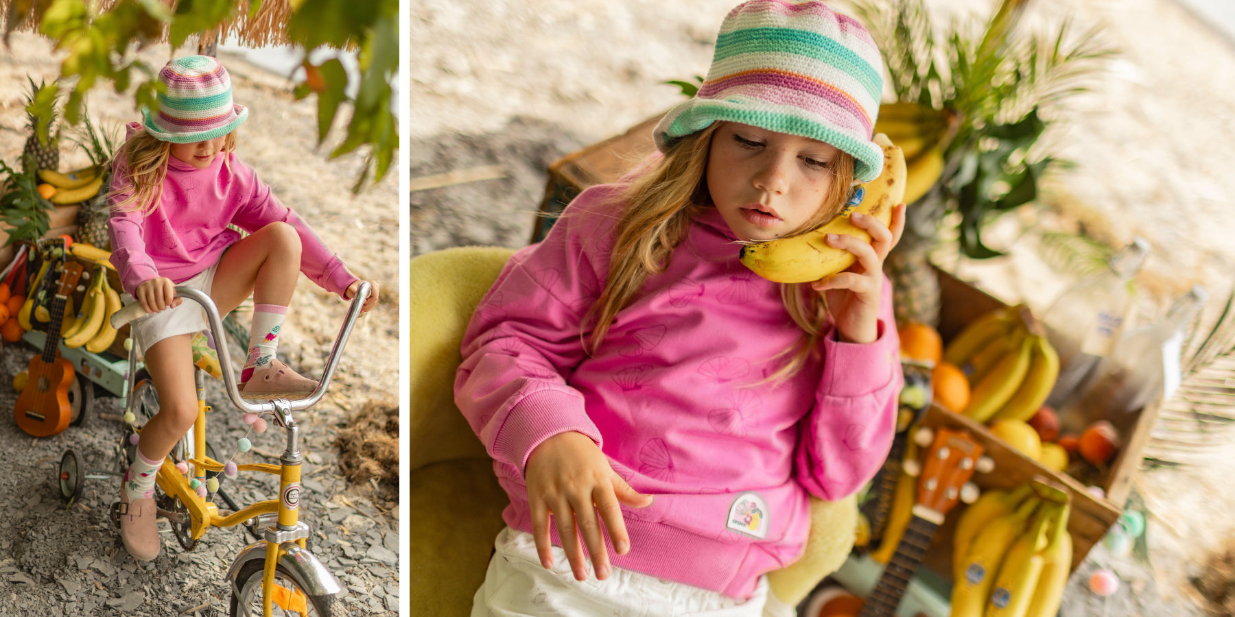 Par ici l'évasion! Robes légères aux imprimés tropicaux, t-shirts amusants, cardigans fruités et petits accessoires colorés s’unissent pour créer des looks joyeux et ensoleillés. Entre teintes lumineuses et motifs de fruits, cette collection apporte fraîcheur et bonne humeur au quotidien.