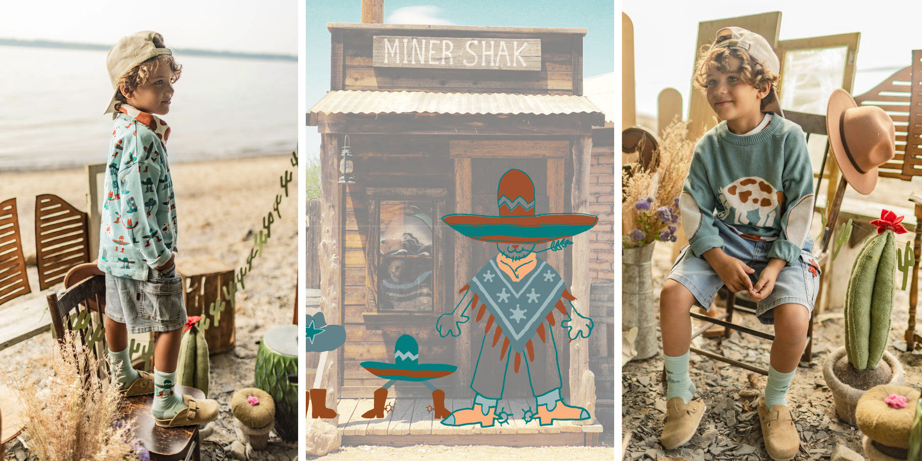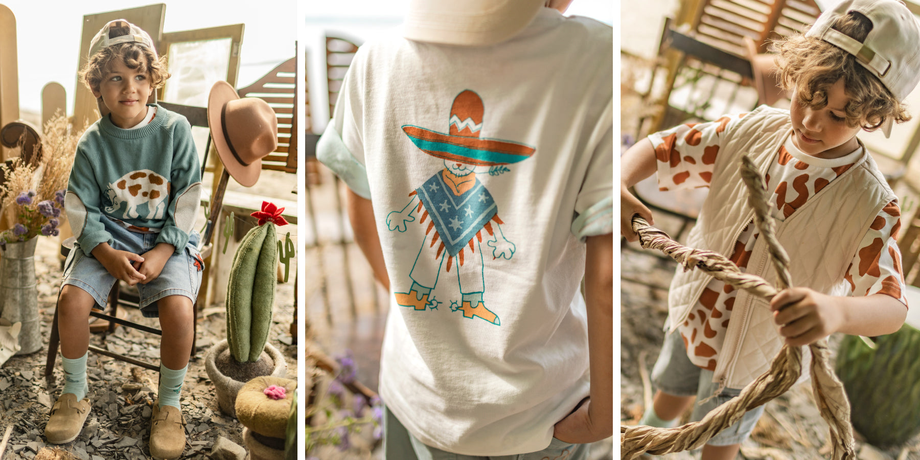Une collection qui plaira à coup sûr aux petits cowboys. Des motifs de chevaux, des carreaux et des détails amusants se retrouvent dans une palette inspirée du désert, aux tons doux et naturels, pour des looks adorables et confortables.