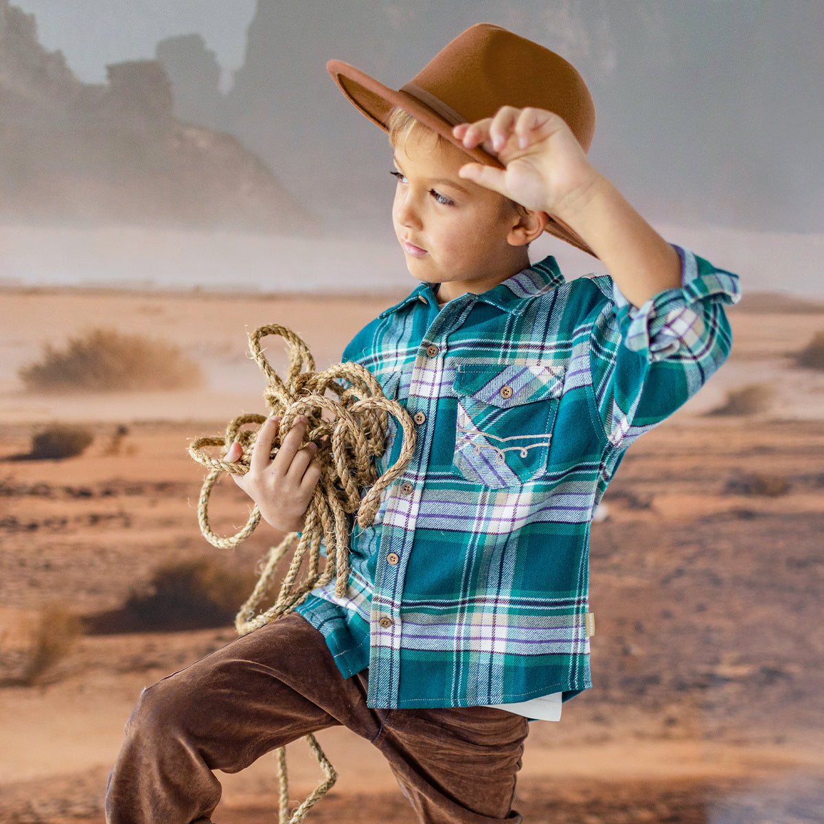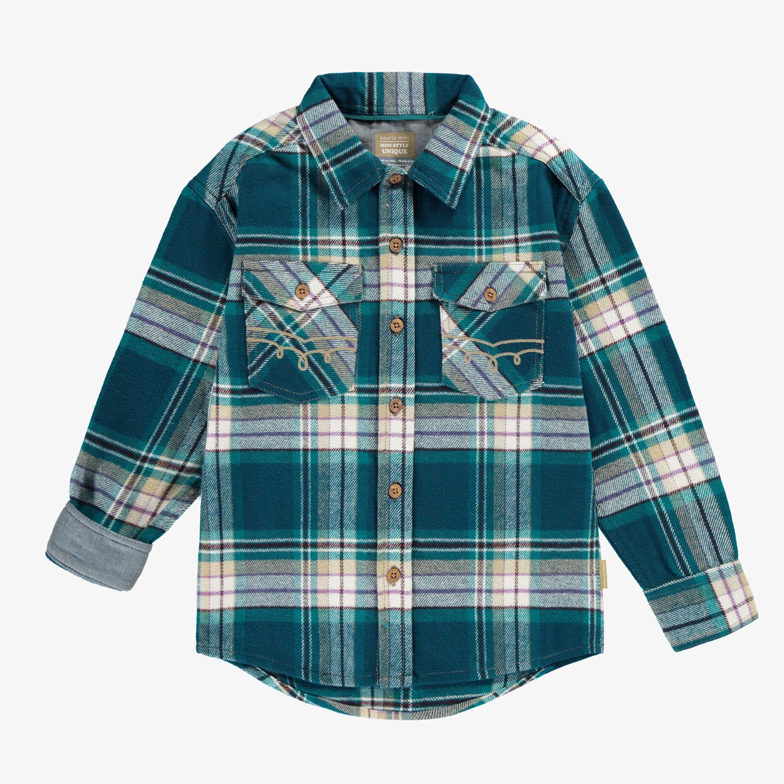 Chemise turquoise et orange à carreaux, enfant