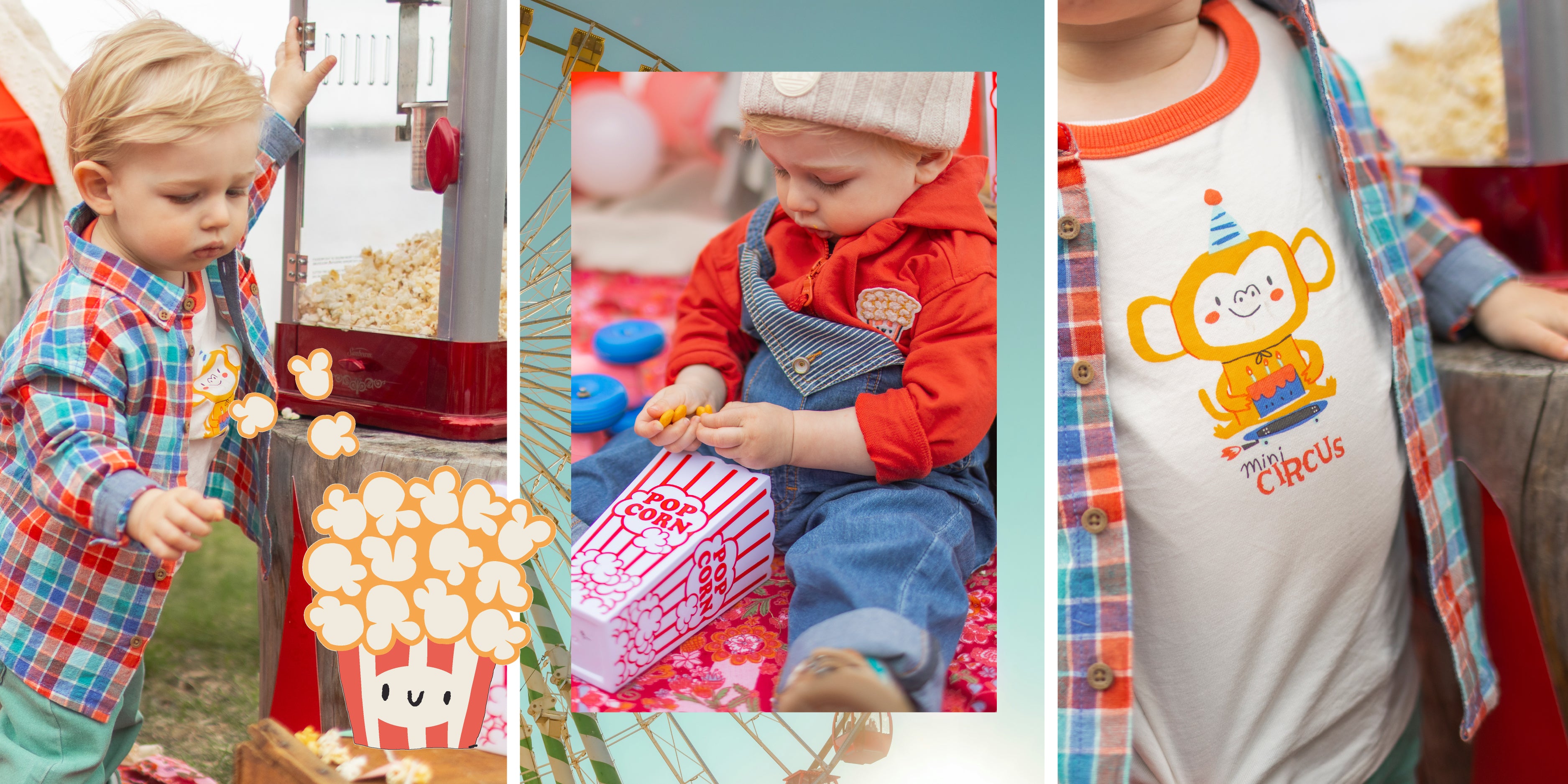 Que le spectacle commence avec cette collection pleine d’énergie et de bonne humeur! Orange éclaté, bleu vibrant, singes festifs et zèbres rigolos transforment les tenues en véritables numéros de cirque. Un look coloré, amusant et joyeux, parfait pour vos petits acrobates!