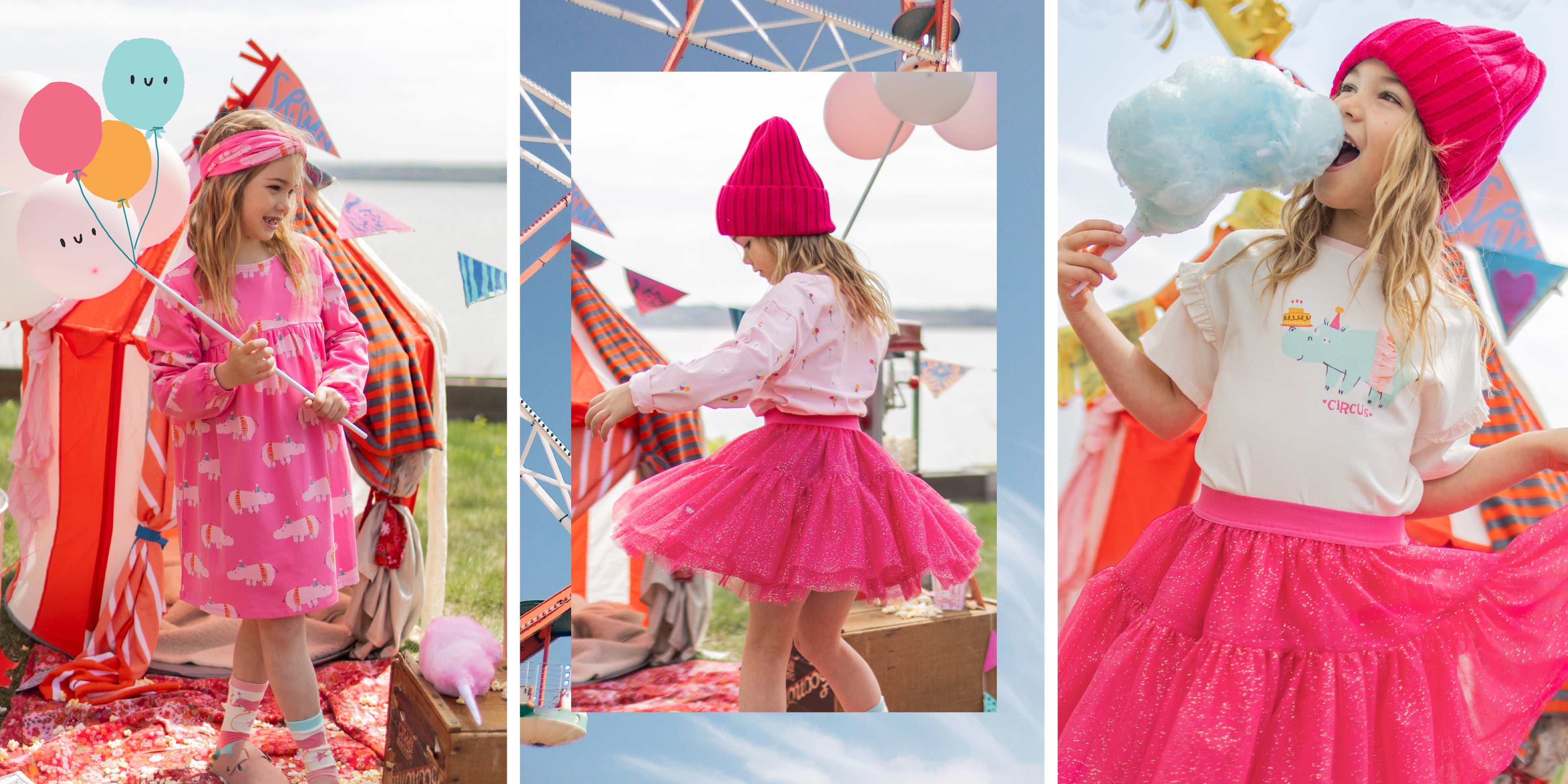 Let the show begin with this colorful and whimsical collection! Sparkling pink, twirly tutu skirt, playful animals, and cute balloons come together for a festive and joyful look, straight from the magical world of the circus!