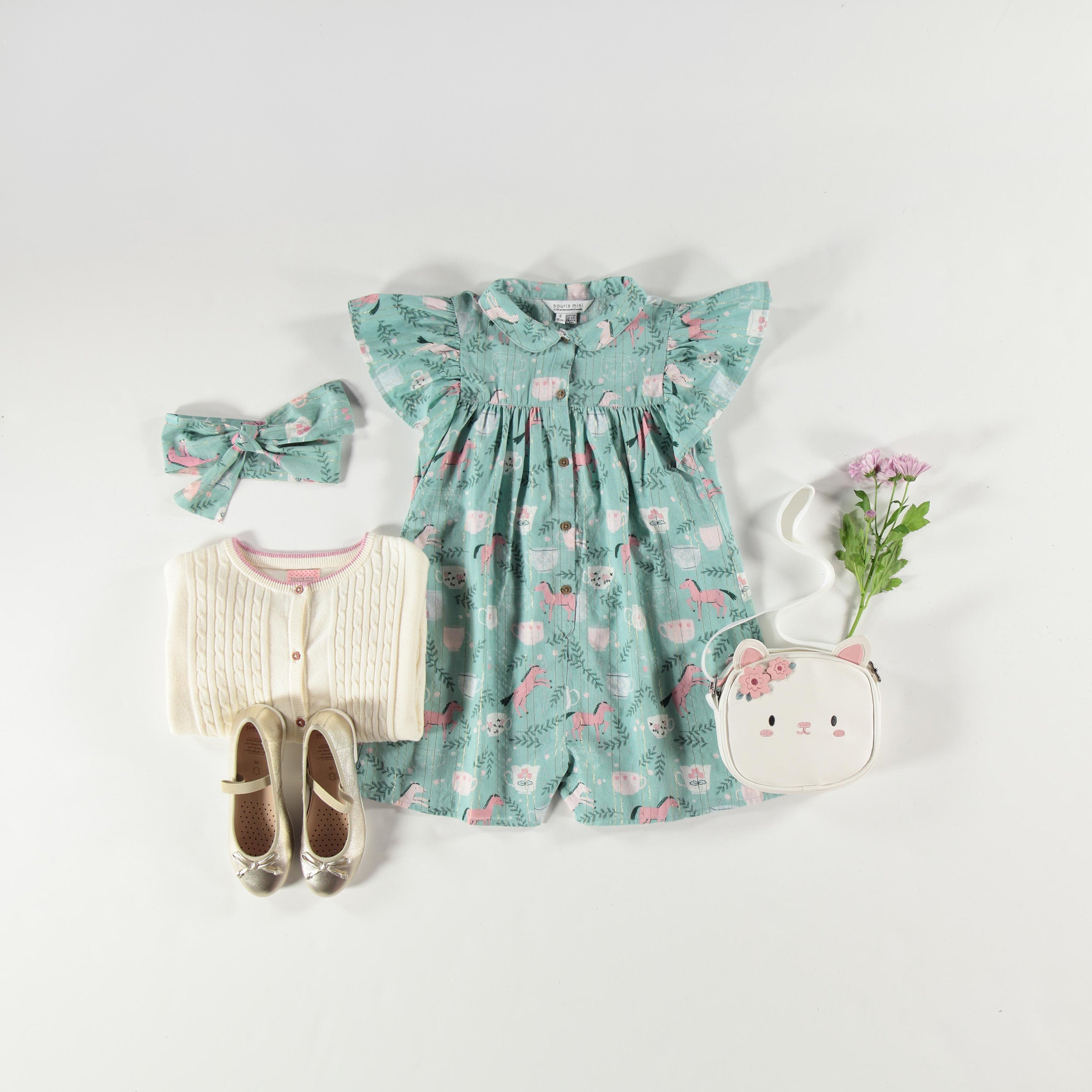 One piece ash turquoise in shimmering poplin with horse all over print, child