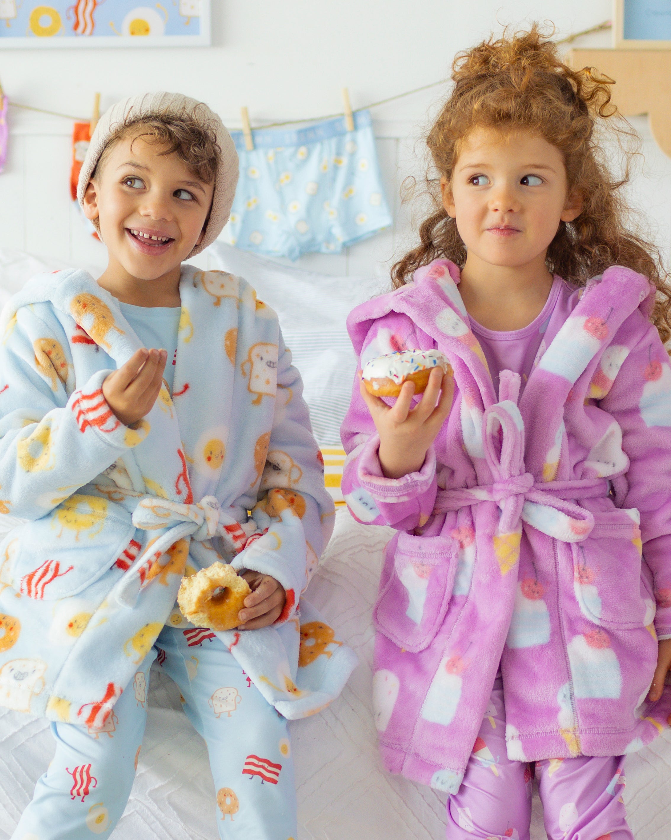 Blue plush robe with breakfast all over print, child