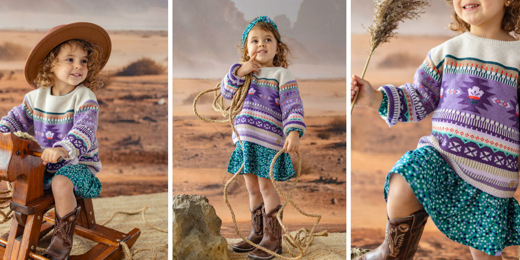 Horses, cactus, fringe, and Navajo-inspired jacquards bring a western flair to pieces that are perfect for little ones who love to stand out. All enhanced by lovely shades of purple and turquoise for a fresh, feminine touch.