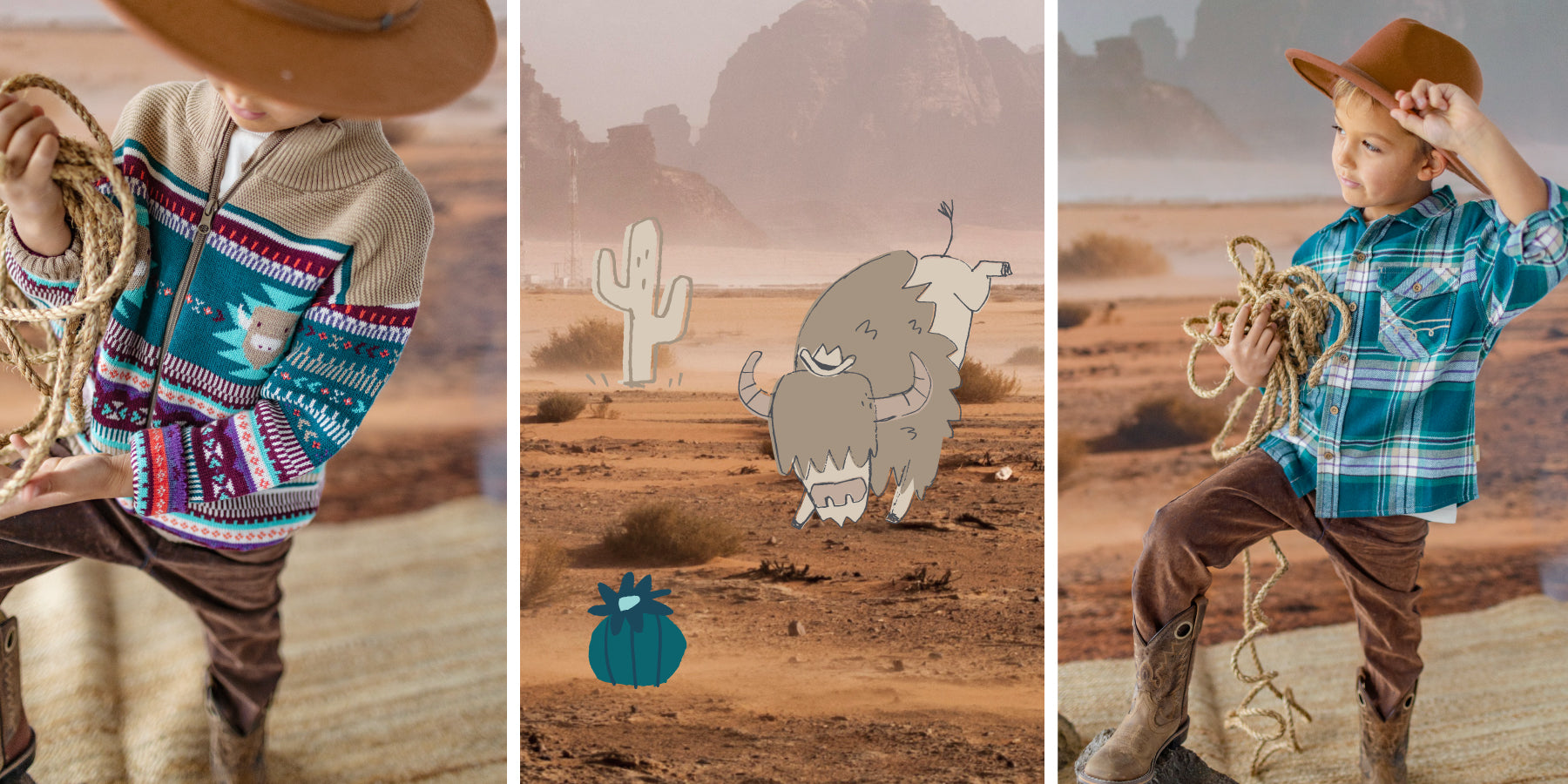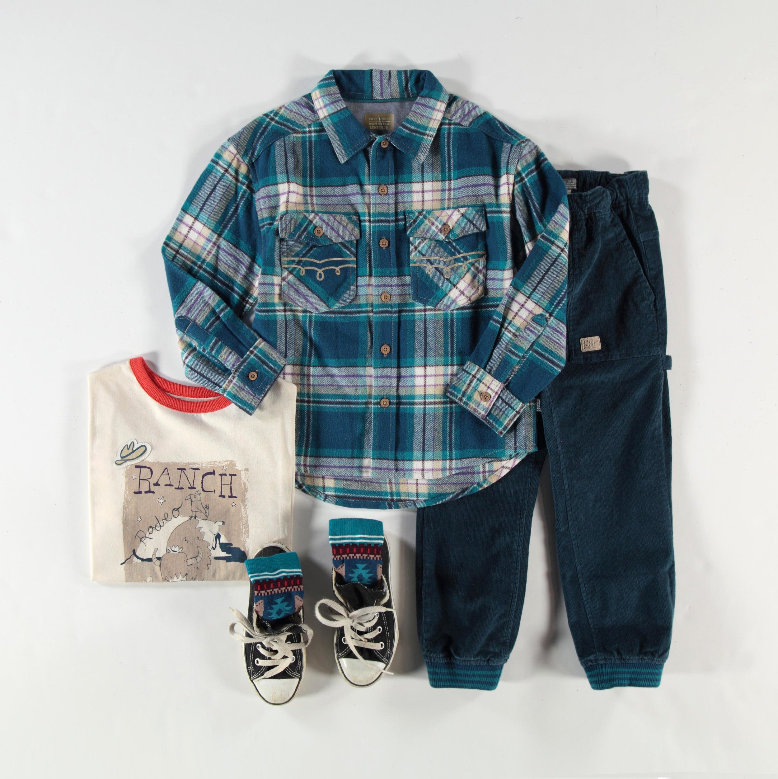 Plaid shirts, corduroy pants, jacquard knit sweaters… our new western collection has everything to please your little cowboys! Comfortable fits, thoughtful details, and a color palette inspired by wide open spaces: brown, beige, turquoise, and brick red. The perfect outfits for adventure, on the schoolyard or out on the ranch!
