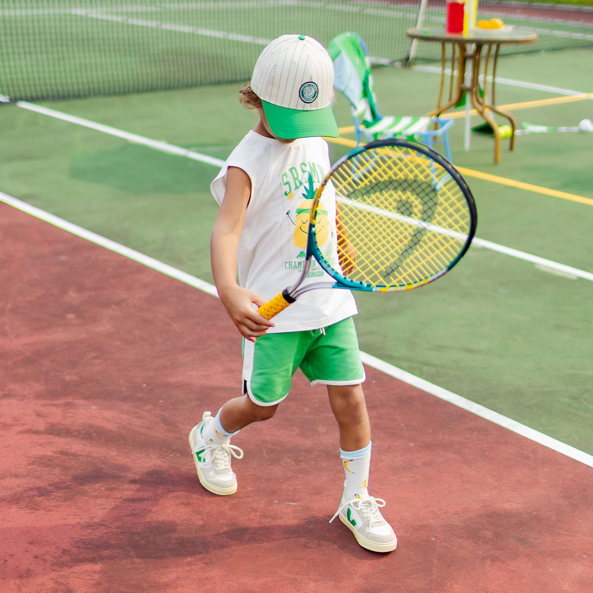 Discover athletic-inspired pieces enhanced with fruity prints. Retro sets, fun patterns, and a touch of preppy style await your little champions.