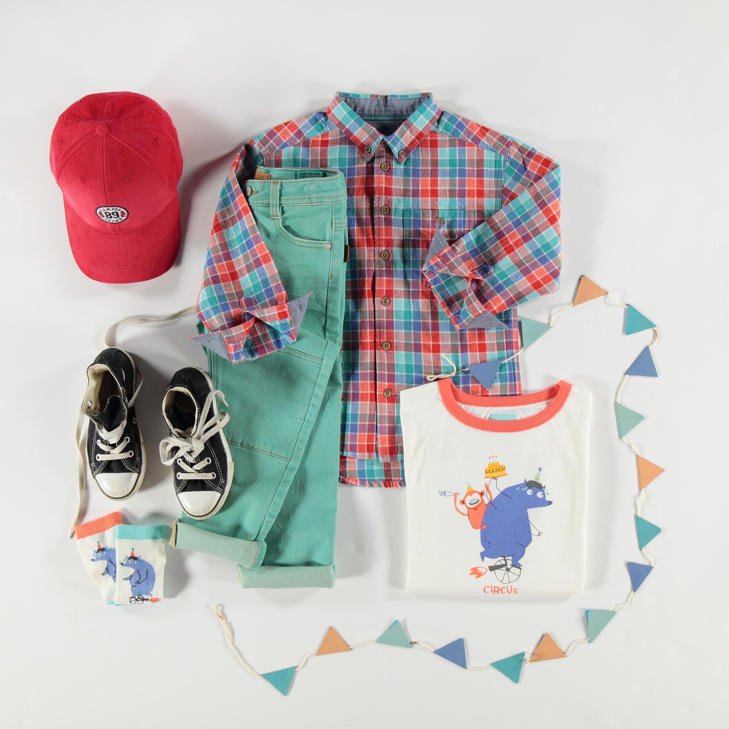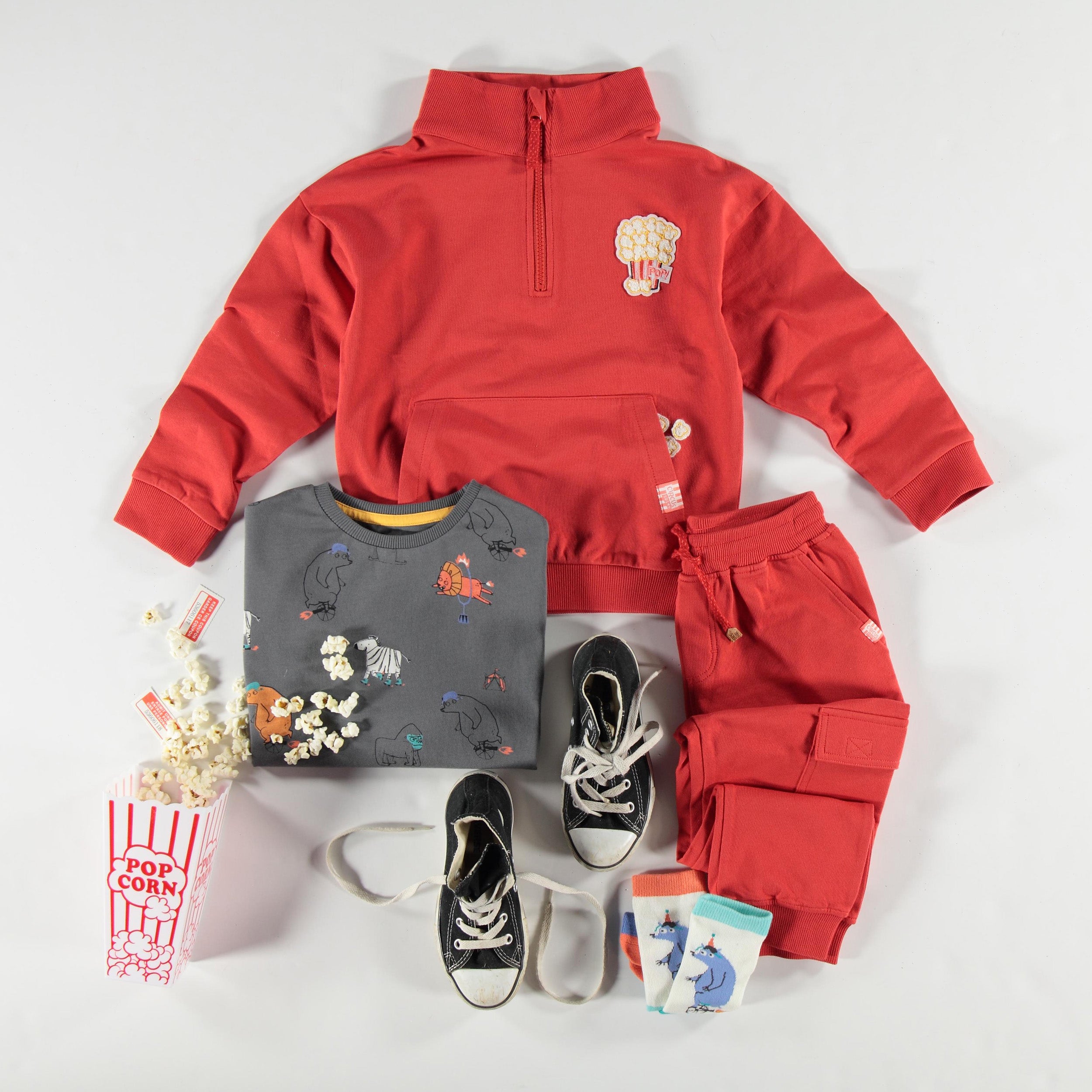 Let the show begin with this high-energy collection!Bold colors, playful animal prints, popcorn patterns, and fun details make their way into your boys’ wardrobe. A joyful and festive style that captures all the excitement of a day at the circus!