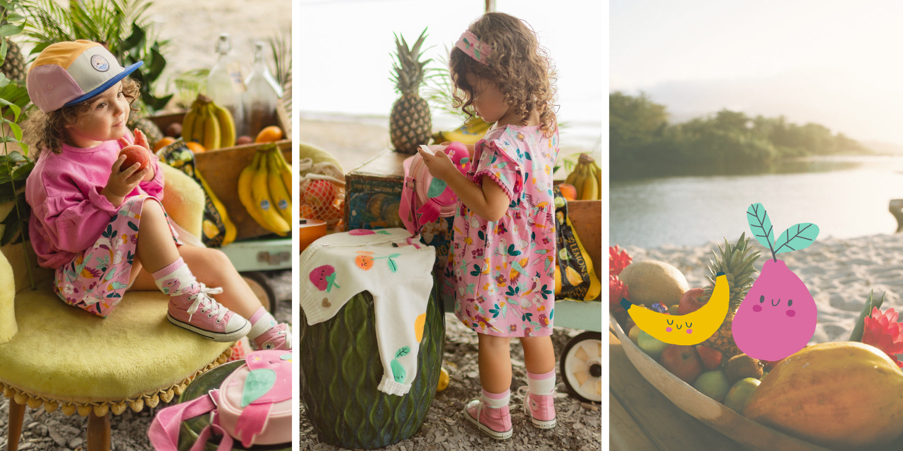 Escape starts here! Lightweight dresses with tropical prints, playful t-shirts, fruity cardigans and colorful little accessories come together to create joyful, sun-filled looks. With bright tones and fruity motifs, this collection brings freshness and cheer to everyday life.