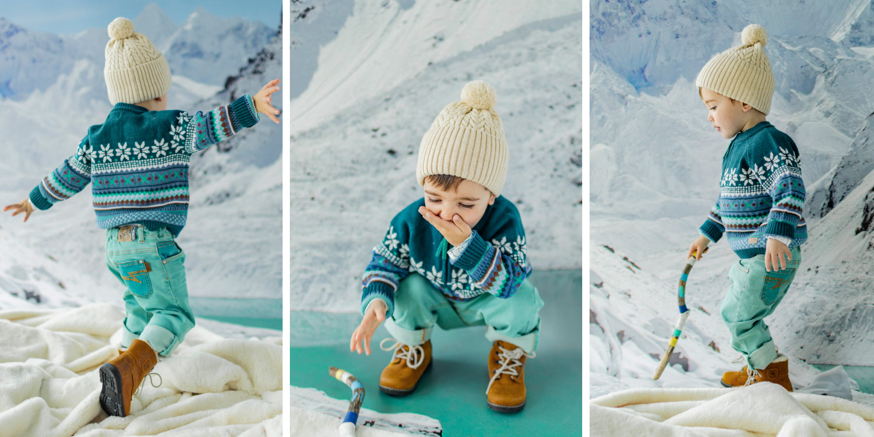 Fuzzy knits and Nordic jacquards in a palette inspired by the Great North: creamy tones, icy turquoise, and deep blue. Style, comfort, and warmth for your little adventurers!