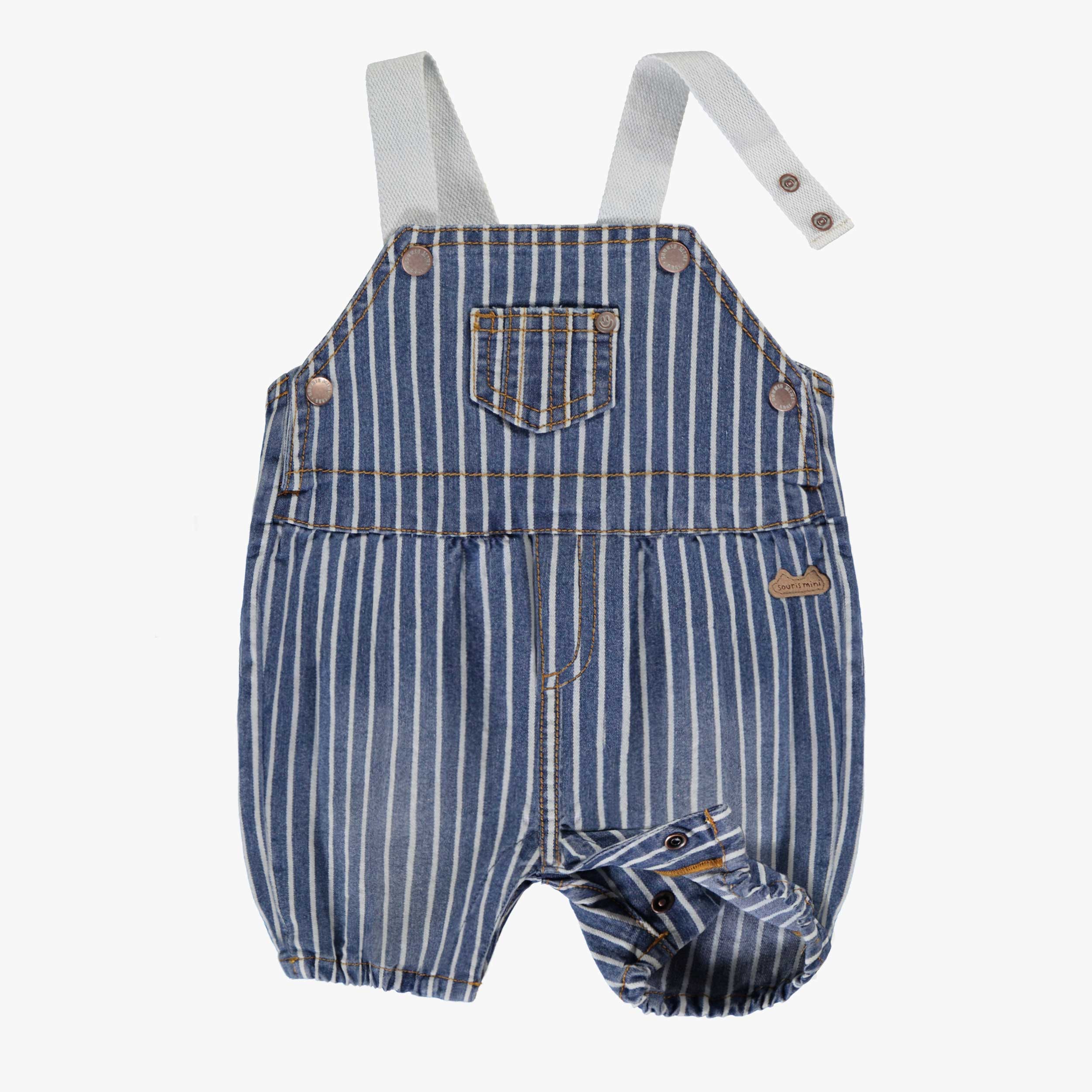 Blue-and-white striped overalls with wide, contrasting, adjustable straps, wide cut, front patch pocket and elastic-tightened thighs, in lightweight cheminot denim for great freedom of movement.Front, side and crotch openings make dressing easy. The worn-effect detail on the edge of the pocket gives it a retro look.A timeless style to wear over a short- or long-sleeved tee, and why not pair with a knit for those chilly days between seasons.-Wide cut-Adjustable straps -Worn effect detail-Elasticated thighs