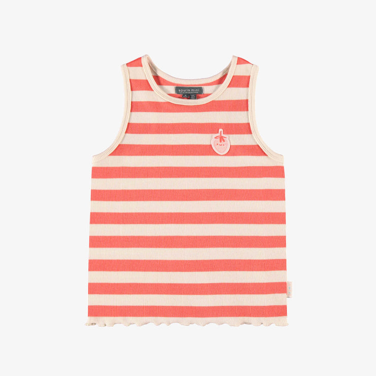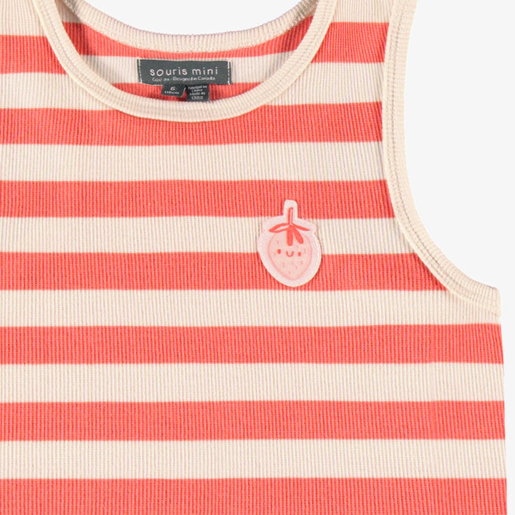 This adorable tank top features cream and pink stripes with a cute strawberry patch. Designed with a round neckline and wide straps, it offers both style and comfort. Made from soft ribbed knit fabric in a snug fit, this simple and practical piece pairs easily with anything!