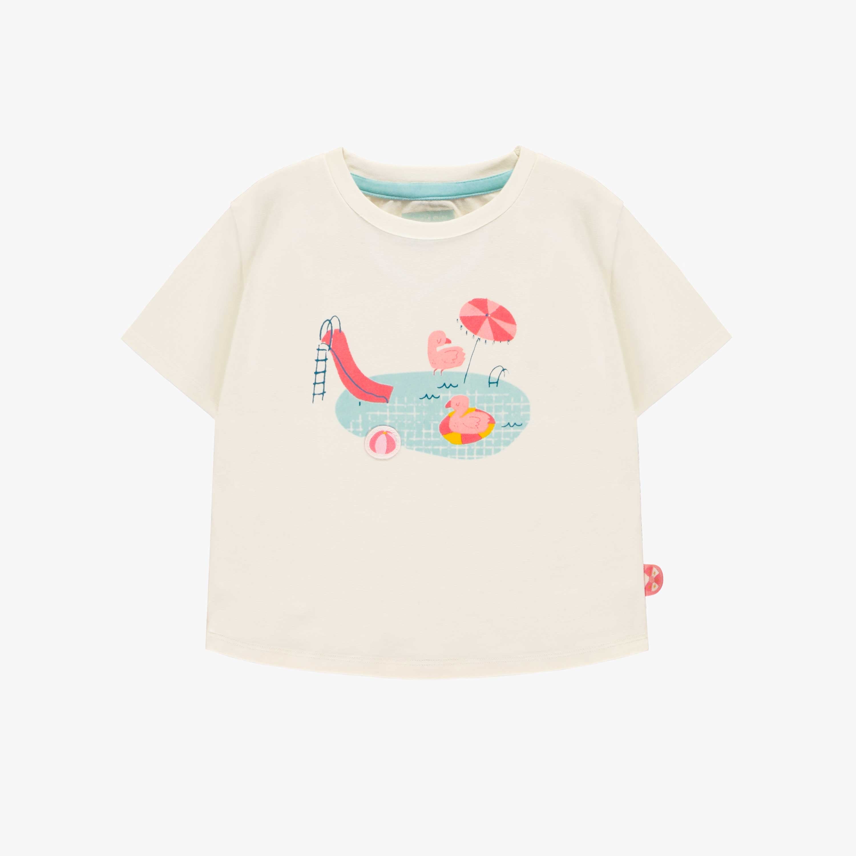 Cream T-shirt with a playful illustration of flamingos swimming! Featuring a round neckline, short sleeves, and a regular fit. Easy to pair thanks to its lovely neutral color. Made from stretchy jersey.