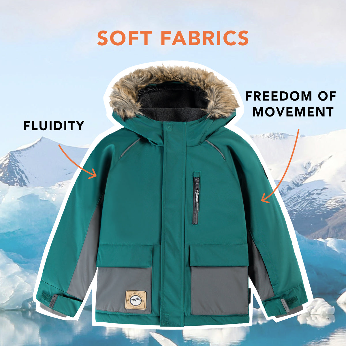Made up of a hooded jacket with faux fur trim and insulated snow pants with adjustable suspenders, this set is perfect for facing winter in style and comfort. Its technical fabric offers optimal protection from cold, snow, and wind, keeping little ones warm down to -30 °C.