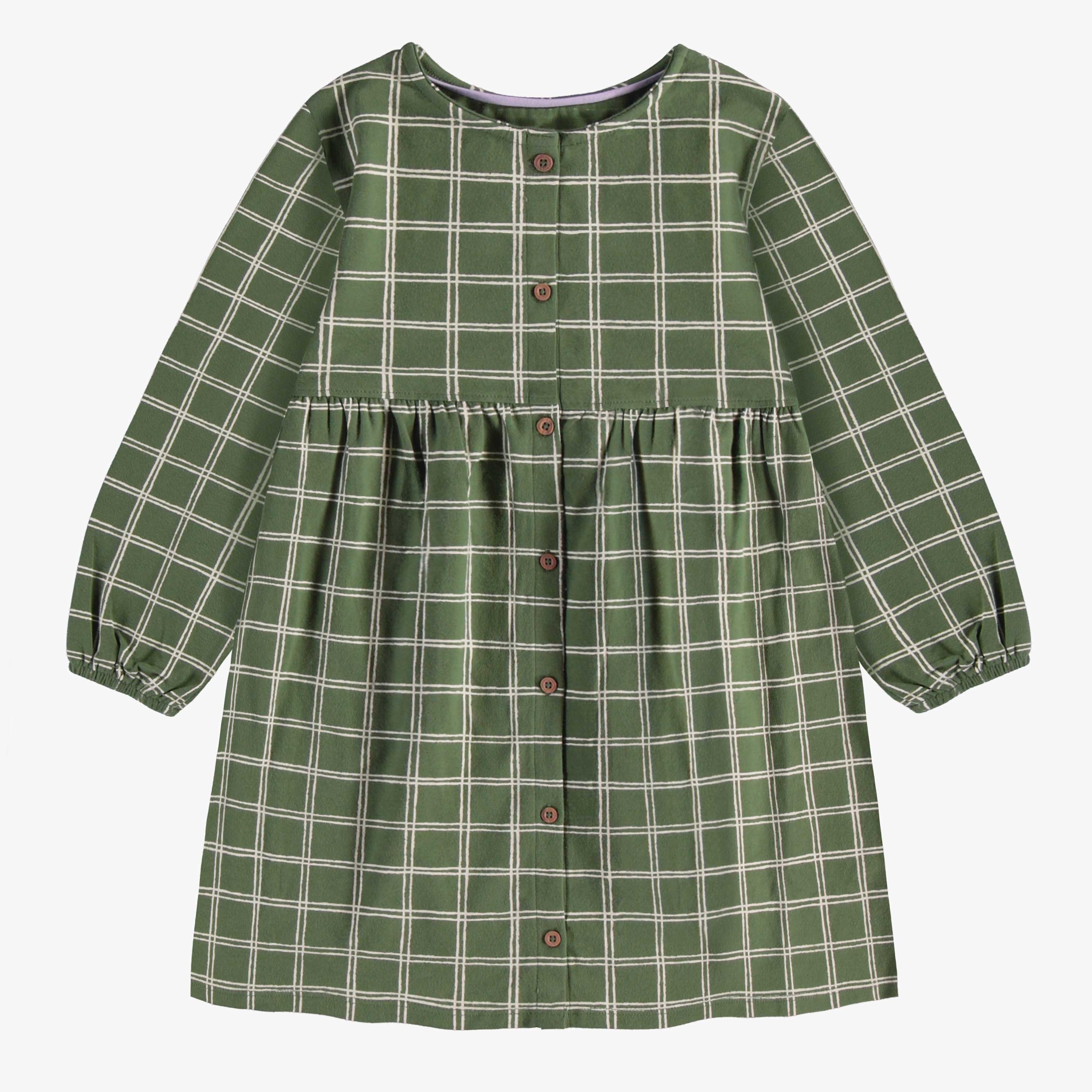 Round neck dress with long puffed sleeves of regular fit at the shoulders with flared bottom offering a feminine silhouette. Easy to put on with a full front opening in imitation wood. With a minimalist and linear printed plaid pattern, gently crafted in a jersey with a comfortable peach skin touch.This dress has no collar to allow you to add your own personal touch, whether by layering the crochet collar, a turtleneck or a shirt collar according to the desired style. Wear with leggings or tights and boots.-Comfortable jersey-Regular fit, flared at bottom-Regular high knee length -Long puffed sleeves-Opening buttons in imitation wood-Plaid pattern