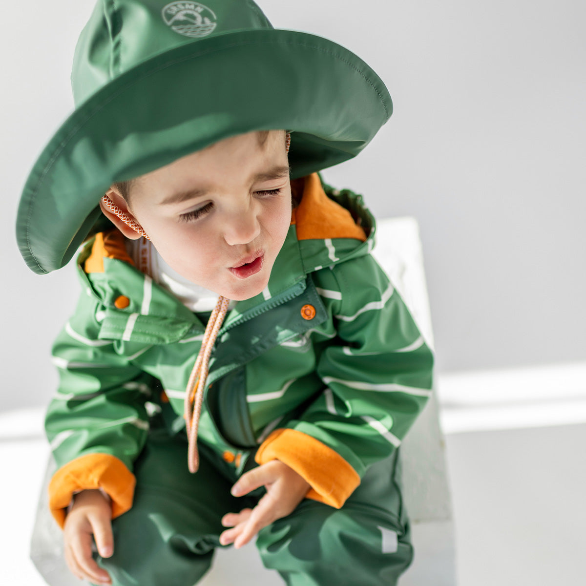 Green rain hat with Souris Mini logo on the front and a wide brim that will cover your head from the rain, which you can stick on with a Velcro strap to lift it up.It has an adjustable chin strap to keep the hat securely in place.Made from water-resistant polyurethane fabric, it pairs perfectly with our waterproof coat for an outfit that will bring joy to your rainy days.-Polyurethane waterproof fabric-Lined-8000mm water resistance-Adjustable chin strap-Velcro strap to lift the brim-Logo