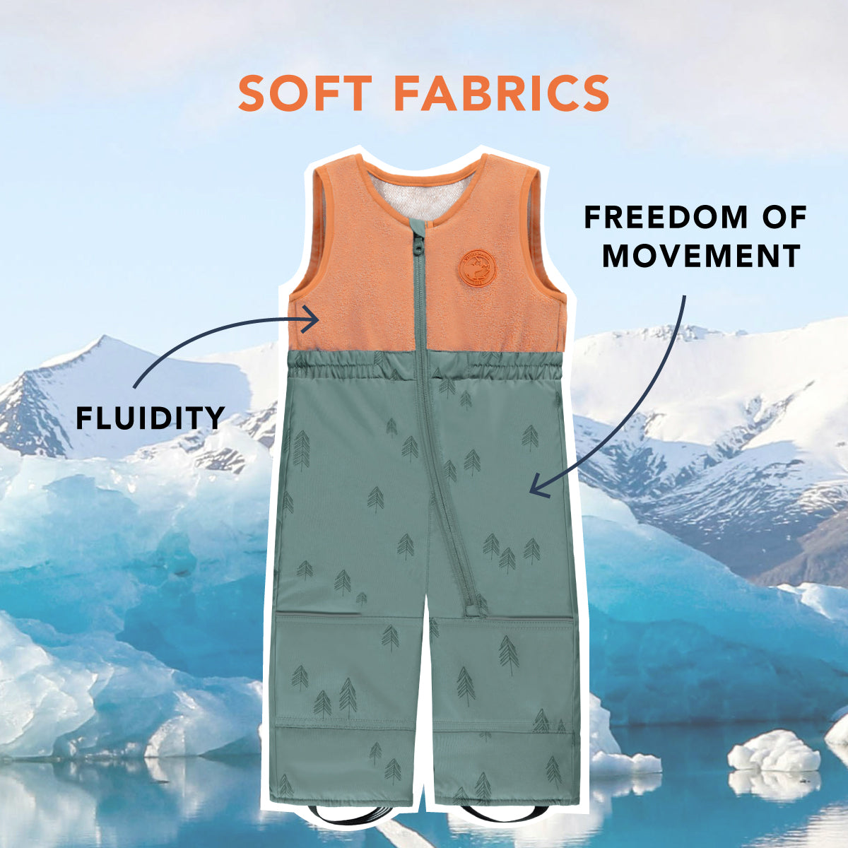Two-piece snowsuit, including a jacket and snow bib overalls, perfect for braving winter temperatures down to -30 °C. Fleece-lined in key areas for added warmth and comfort. Outer fabric is water-resistant (20,000 mm), windproof, and stain-resistant thanks to the Teflon® coating.