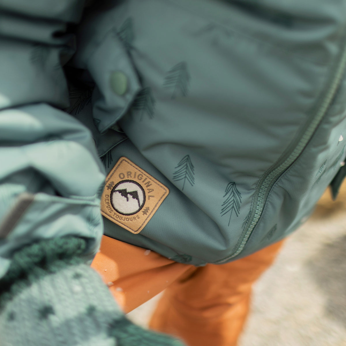 Green two-piece snowsuit with fir tree all over print, child