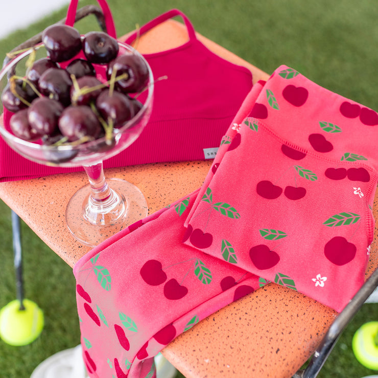 Pink sports legging made from comfortable lycra. Featuring a wide waistband for excellent support and an adorable cherry print. Pair them with the matching sports camisole for a stylish athletic look.