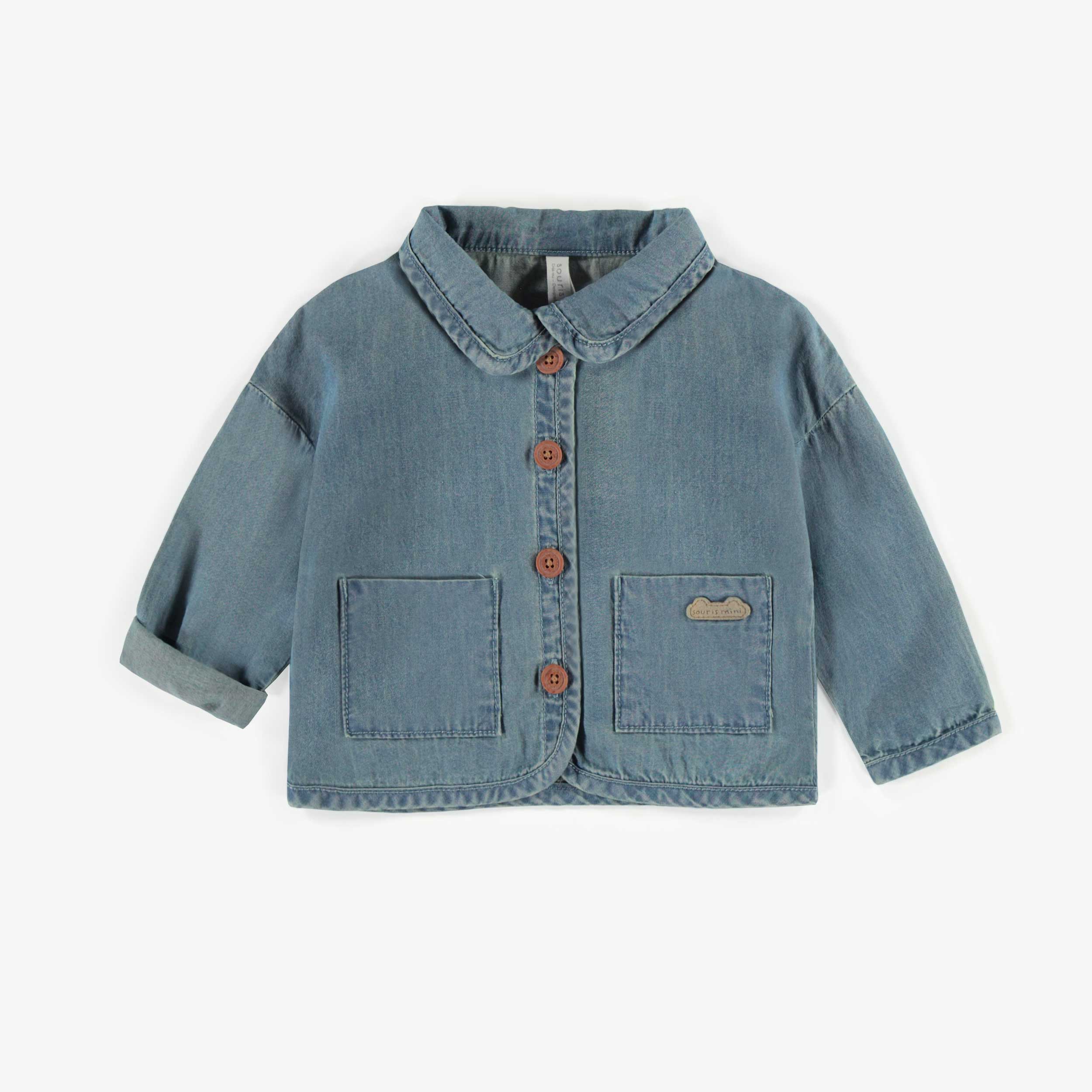 Light denim long-sleeved vest with high collar, a buttonhole at the front to fasten it and large pockets. Made of 100% cotton.