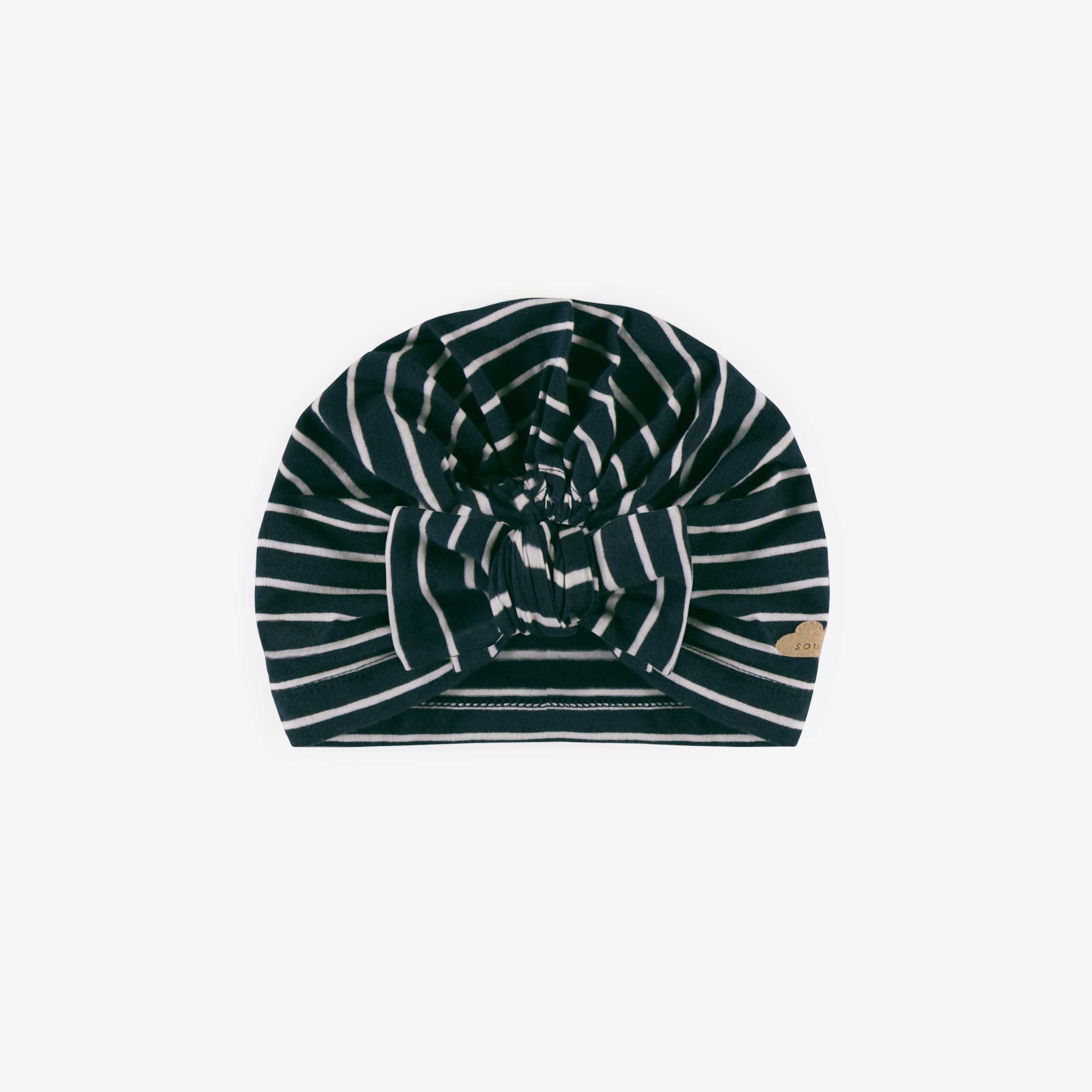 Navy striped turban hat with a bow in front made in soft and stretchy organic cotton jersey, perfect for baby's delicate skin.Your little one will look great in this comfortable and practical hat that will keep his head warm while giving him a trendy look.-Keep your head warm-Organic cotton -Front bow