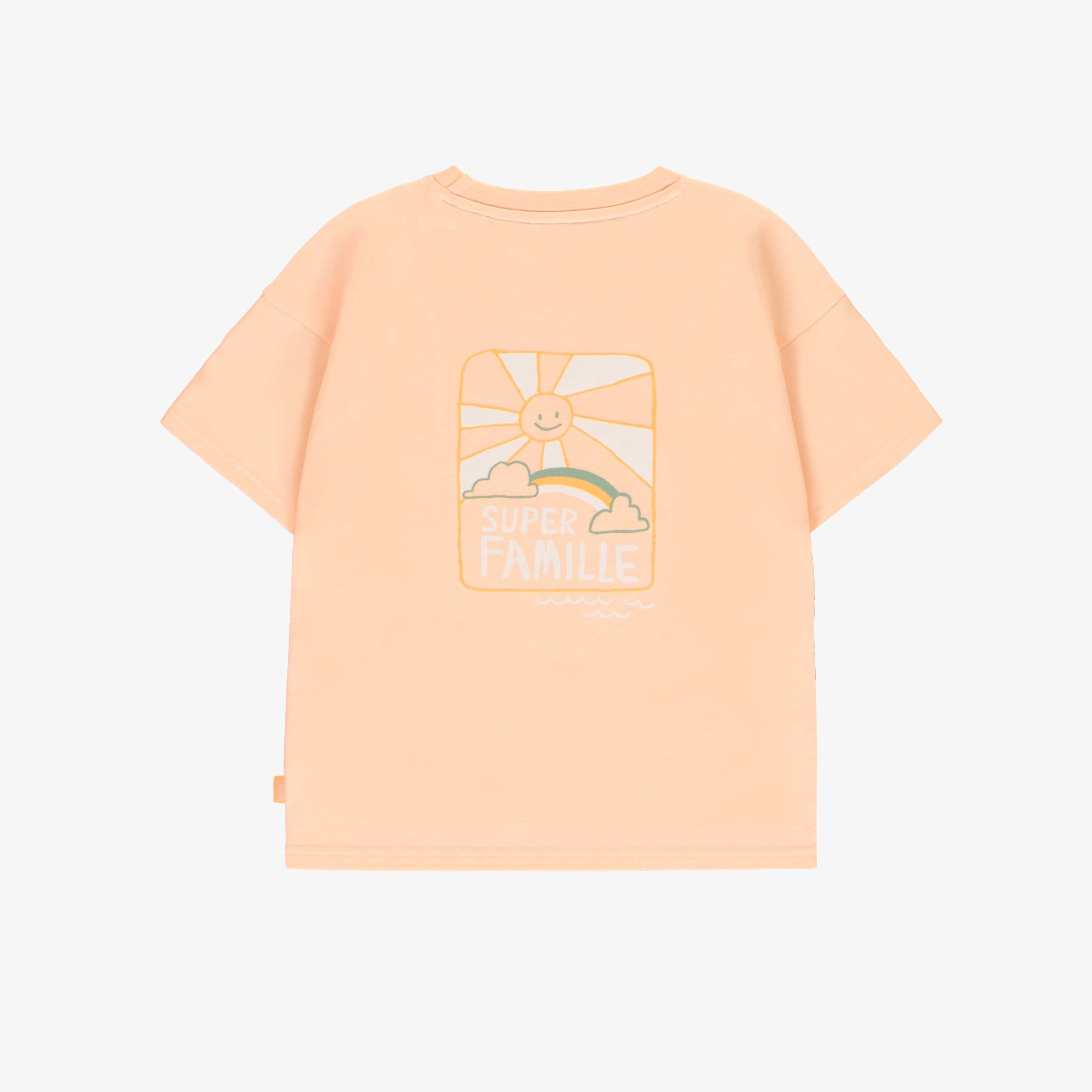 Peach t-shirt with round neck, short sleeves and relaxed fit. It features a pretty family illustration on the back and a small SRSMN logo on the front for a minimalist look.