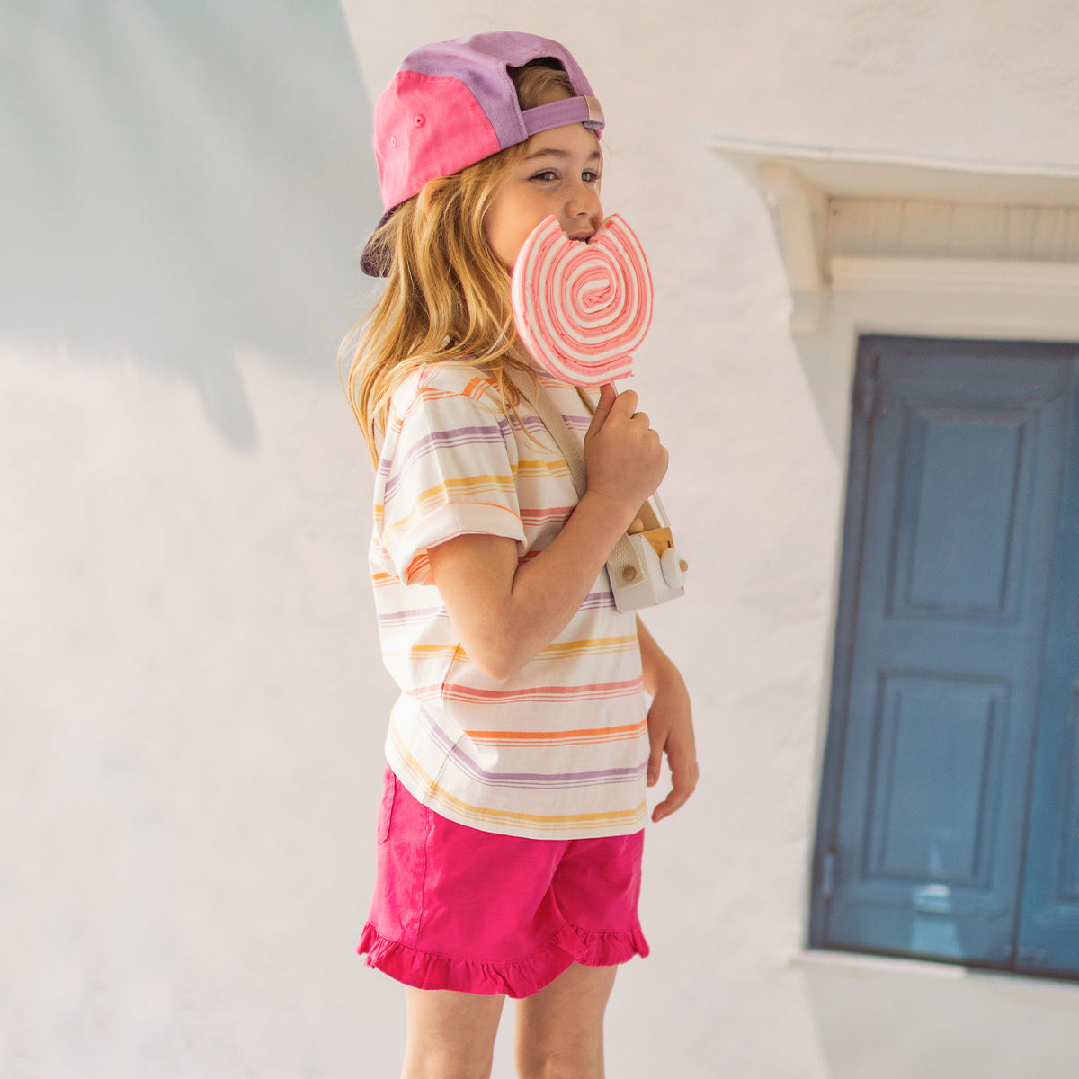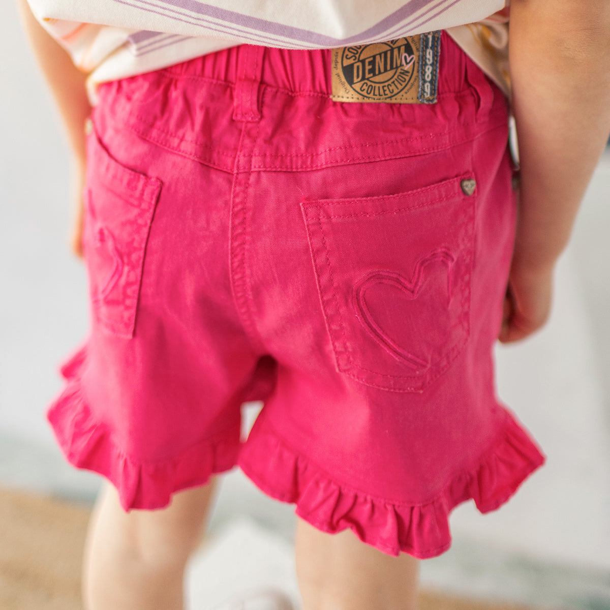 Pink lyocell shorts with an elastic waistband for maximum comfort. Features two front pockets, two back pockets, and ruffles at the hem for an absolutely adorable look! Made from light & stretch lyocell in a regular fit.