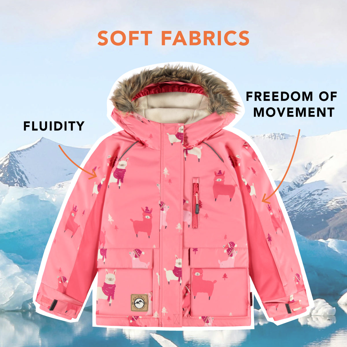 Pink two-piece snowsuit with llama all over print, child