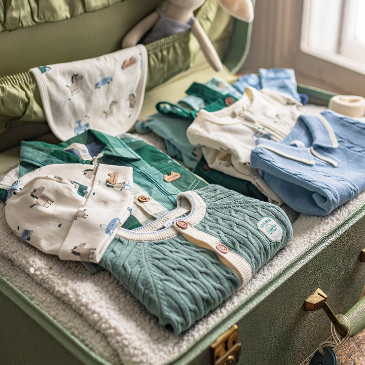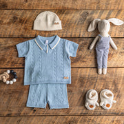 A pale blue t-shirt in fine, lightweight 100% cotton knit. The polo neck and buttonless front opening have a white line to accentuate the sophisticated look of this piece.Note the vertical twists in the knit and the straight hem with rolled finish.It will look great with the turquoise knit sweater and pale blue knit shorts. For a casual look, pair it with denim.- Mesh- Twists- Short sleeves- Polo collar with white line