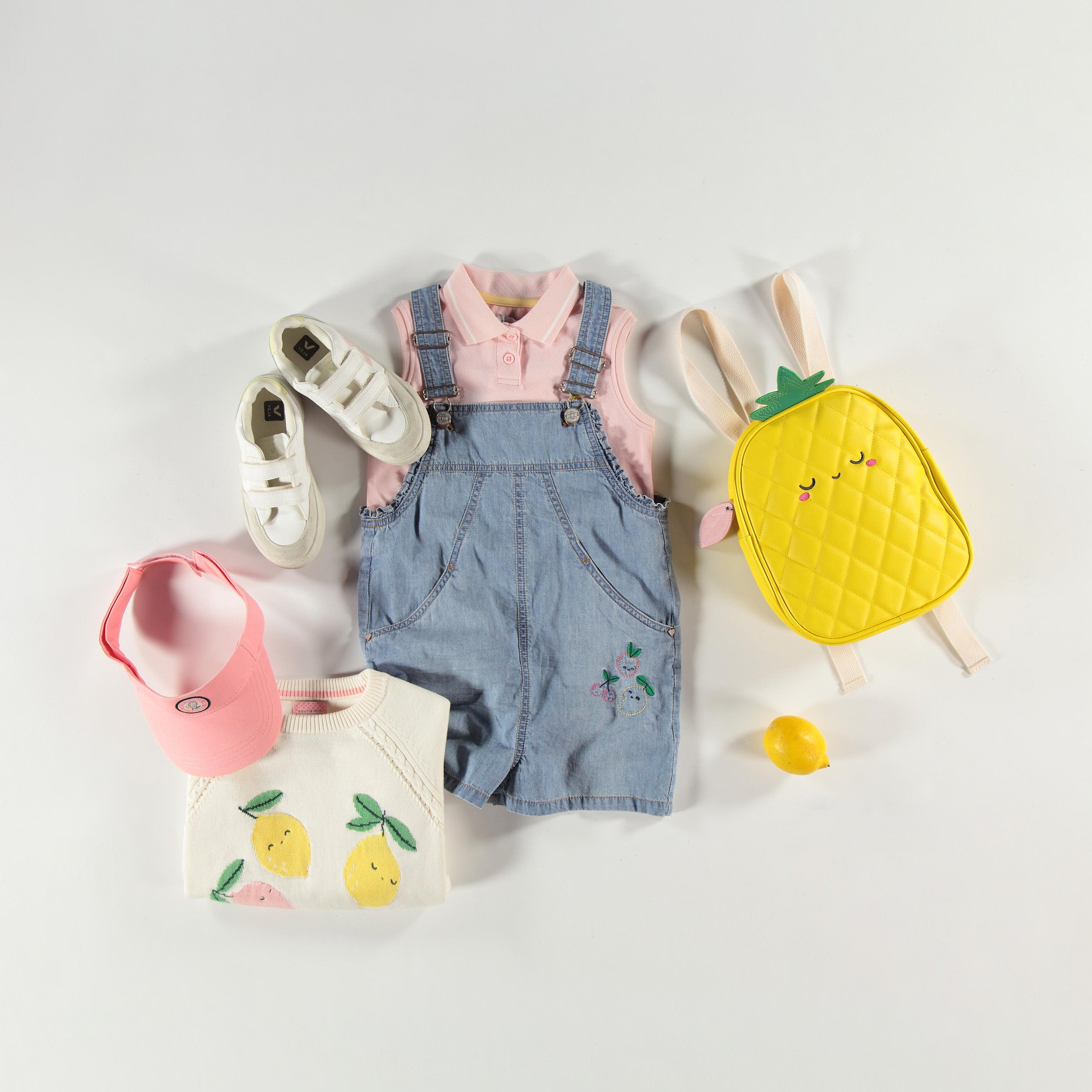 Short overalls in lightweight pale blue denim with adjustable straps. Featuring a straight neckline, delicate ruffles on the armholes, three pockets including one on the back, and a pretty fruit embroidery on the thigh;