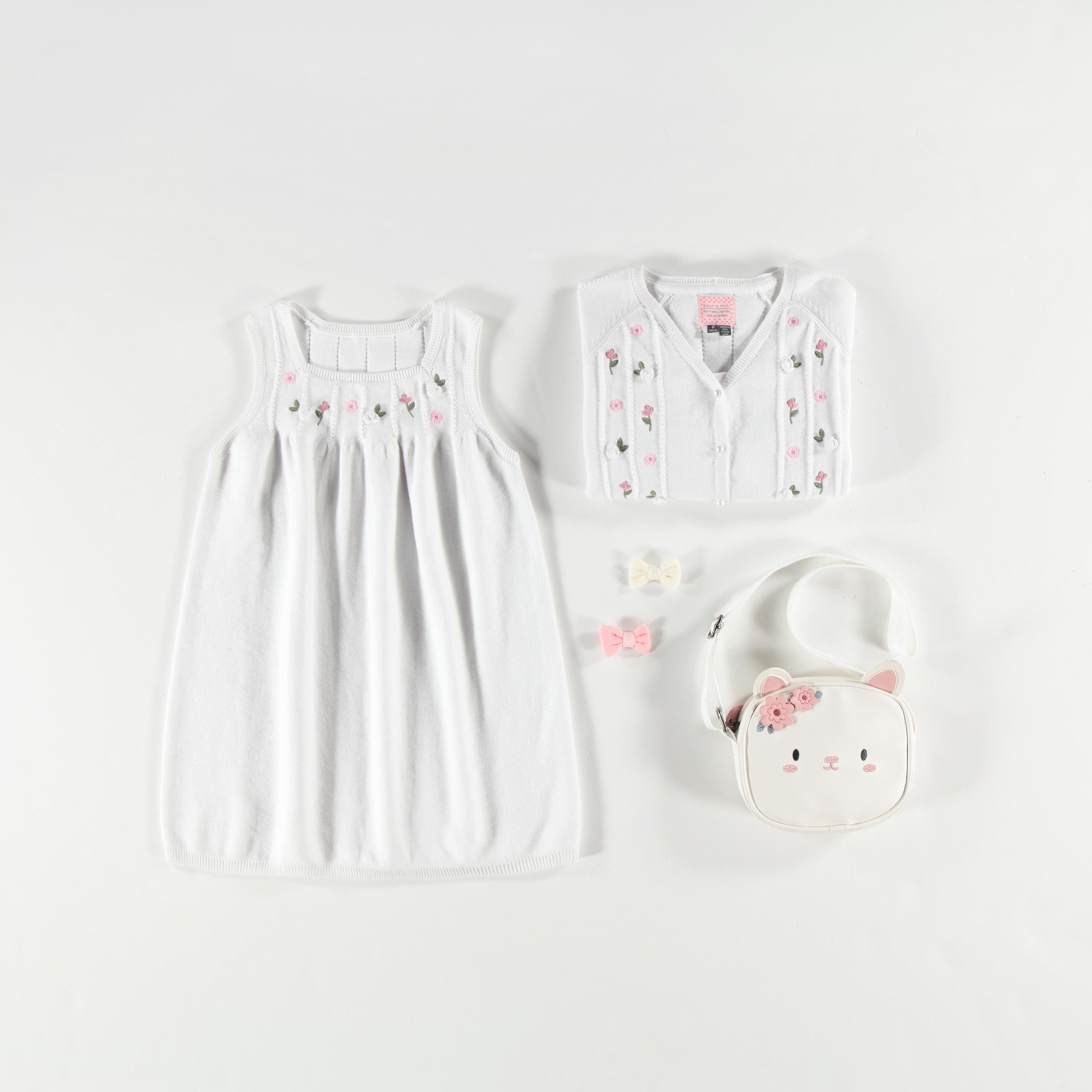 White knit dress with floral embroidery for an elegant and romantic look. Features wide straps and delicate openwork patterns in the knit.