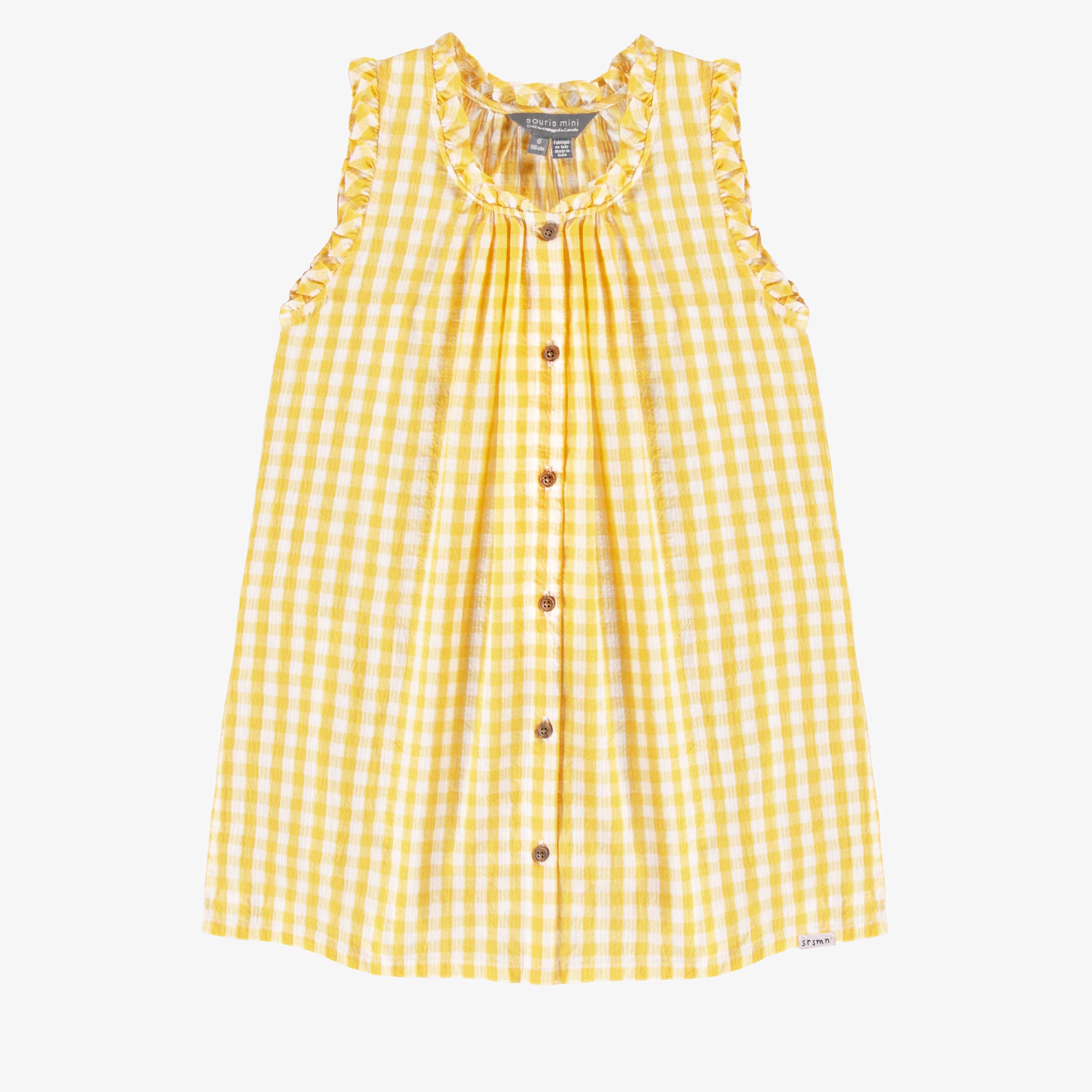 Yellow and white plaid dress with V-neck and wide straps with small ruffles, a buttonhole on the front and a flared cut. Made from 100% cotton lightweight seersucker. This dress is an essential for the summer with its light fabric and classic style.Add leggings as needed and accessorize it with a hat.-Lightweight fabric-Buttonhole on front-Checkered-Flared fit
