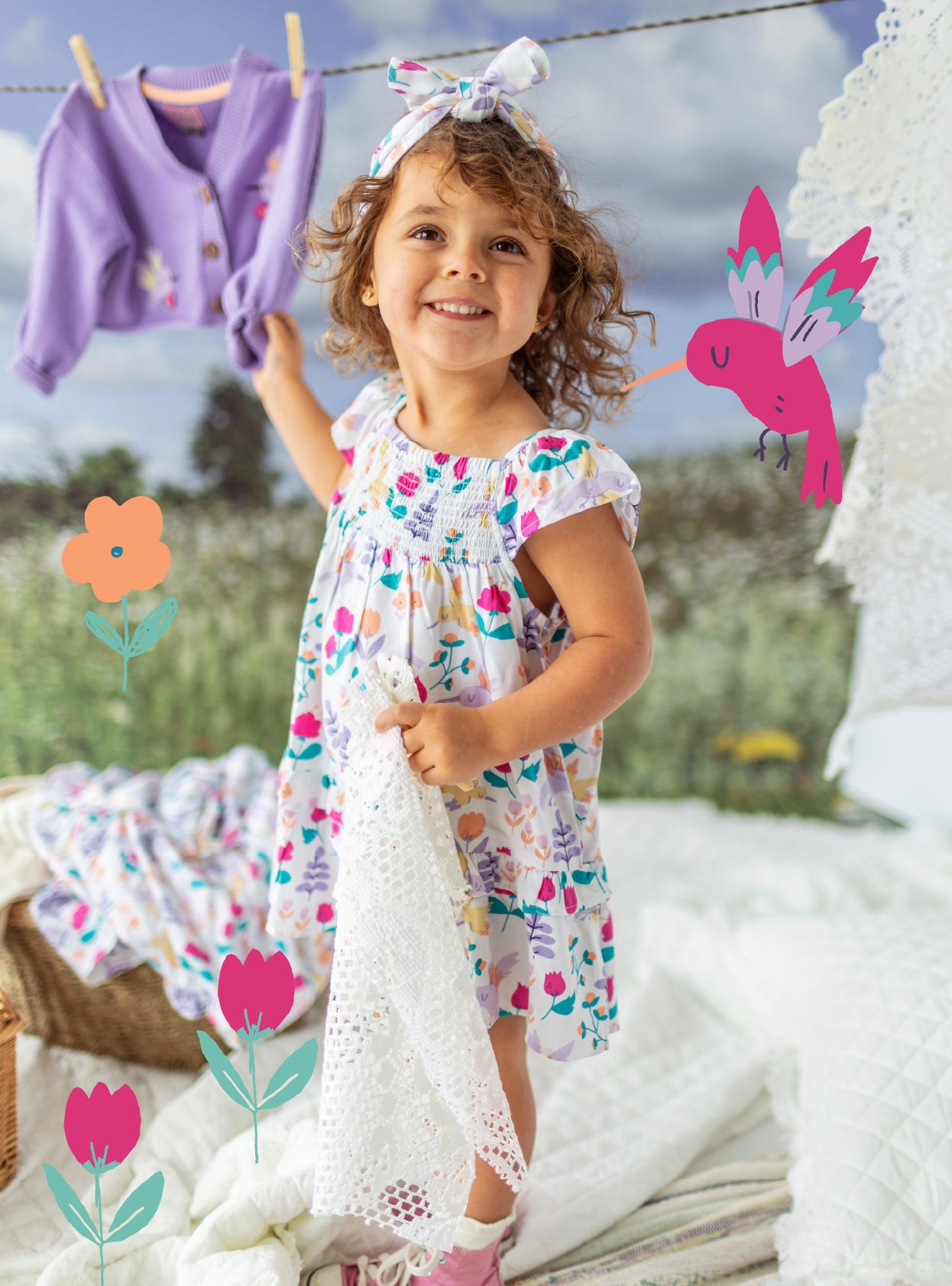 Fleurs exotiques, motifs inspirés de la jungle et couleurs éclatantes se rencontrent pour créer des pièces qui feront le bonheur de vos petites.