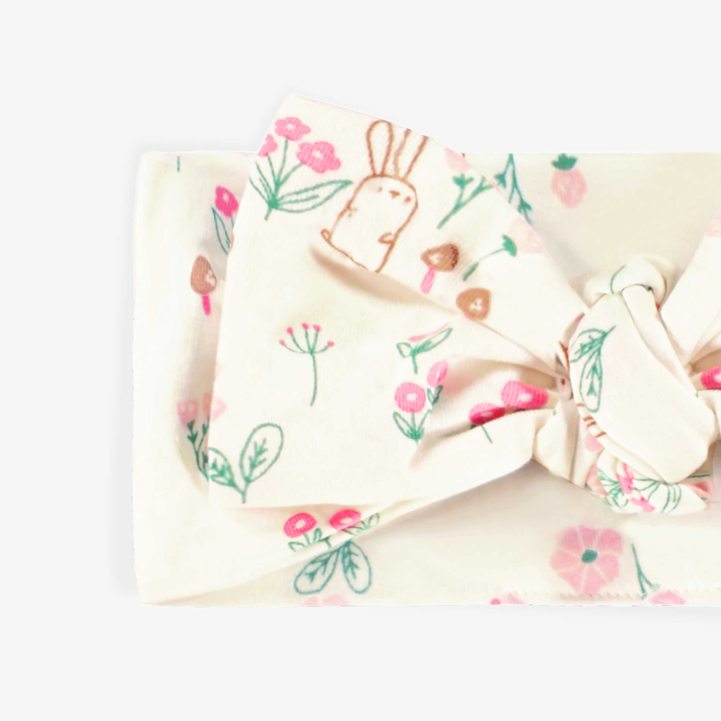 Bandeau crème avec des motifs de lapins et de fleurs, il s’agence à merveille avec le pyjama ou la robe du même imprimé! La boucle à l’avant est ajustable afin de bien tenir sur la tête de bébé. Fabriqué en jersey de coton extensible afin d’offrir un maximum de confort. Nœud ajustable Jersey de coton extensible