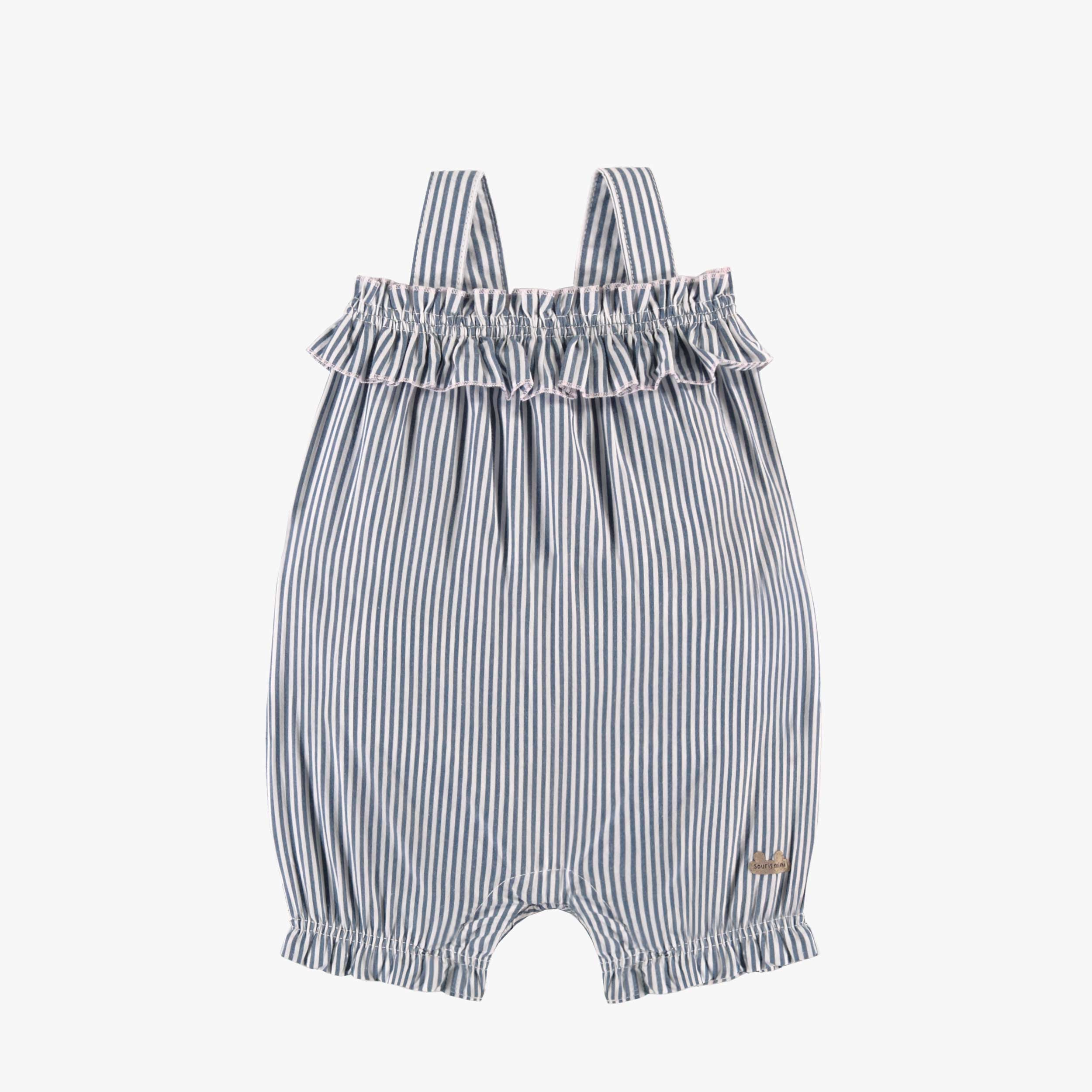 Ensemble une-pièce bleu et crème à fines rayures verticales en douce et légère popeline. Orné de fines bretelles qui s’attachent au dos avec deux positions en hauteur, d'un volant élastique à la poitrine. Fini d'un fil rose dans le haut et le bas du volant. Les cuisses sont aussi élastiques avec nid d'abeille. Agencer avec un bandeau crème ou d’un chapeau pour protéger votre mini du soleil et profiter du beau temps. -Fibre de tissu 100 % naturelle qui respire bien-Coton léger et confortable-Coupe ample-Fines bretelles-Haut et chevilles élastiques-Rayures fines-Volants