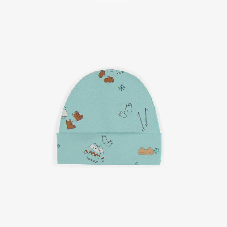 Bonnet bleu pâle à motifs dans le thème du ski comme des chandails de maille, des mitaines, des skis et d’autres illustrations fait dans un coton biologique.