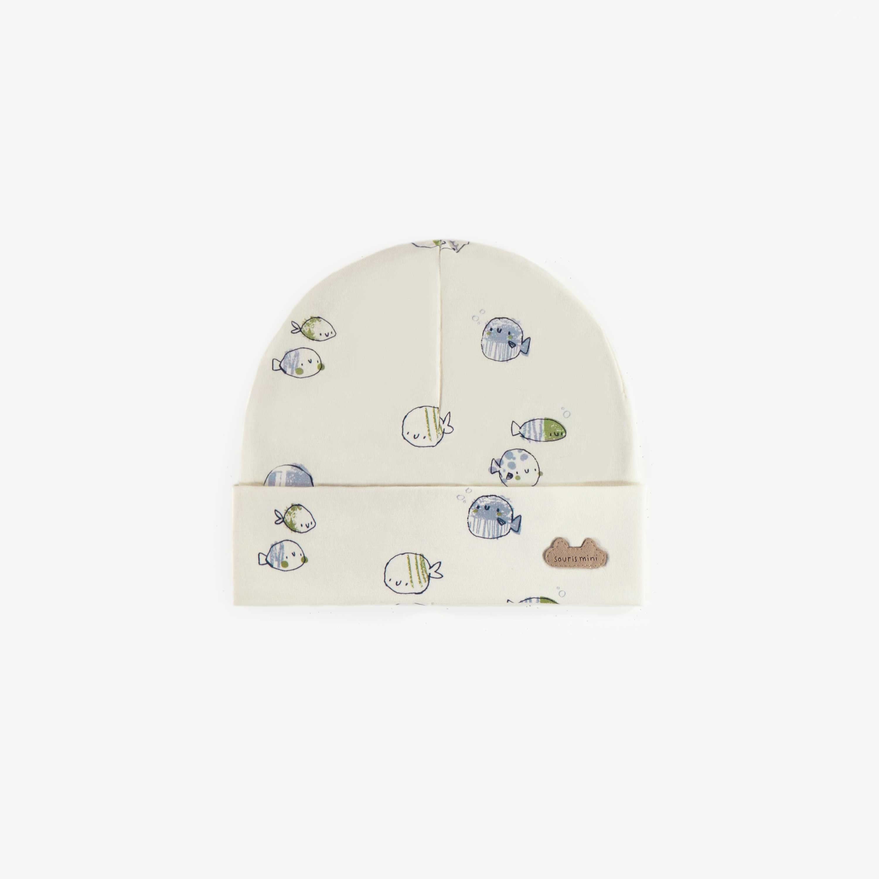 Bonnet crème à motif de poissons bleus et verts en coton biologique, naissance