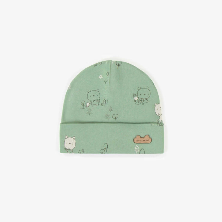 Bonnet vert à motifs en jersey de coton biologique extensible, idéal pour lui garder la tête au chaud tout en confort.