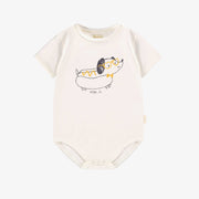 Cache-couche crème avec une illustration d’un mignon chien saucisse. Comprend un col rond, des manches courtes et des boutons-pression à l’entrejambe pour faciliter l’habillage. Fabriqué en jersey de coton pour un maximum de confort.