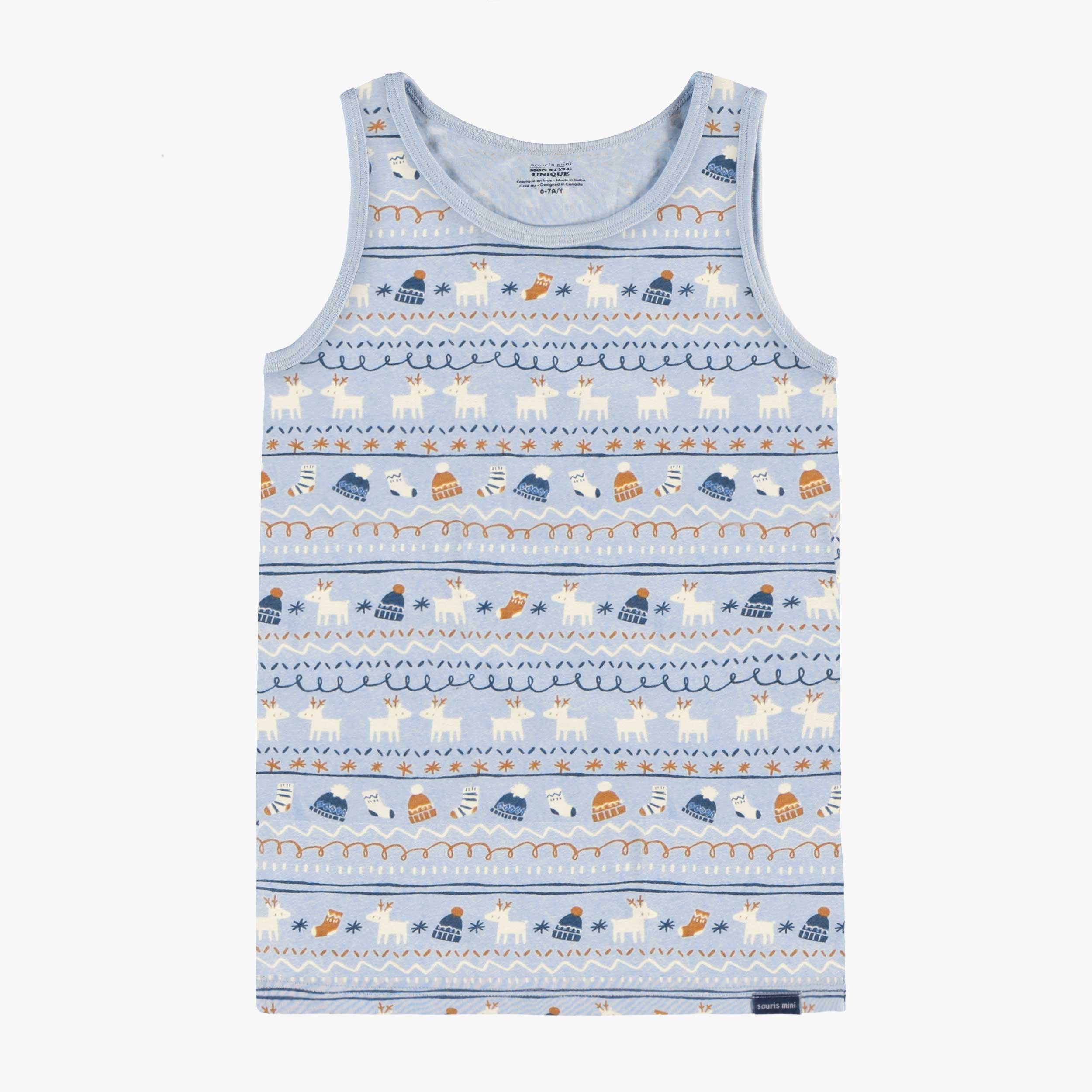 Camisole bleue à larges bretelles, faite dans un doux jersey de coton extensible. Un look amusant avec son motif automnal de lignes, de rennes, de chandails, bas et tuques de maille dans les teintes de crème, bleu et caramel.