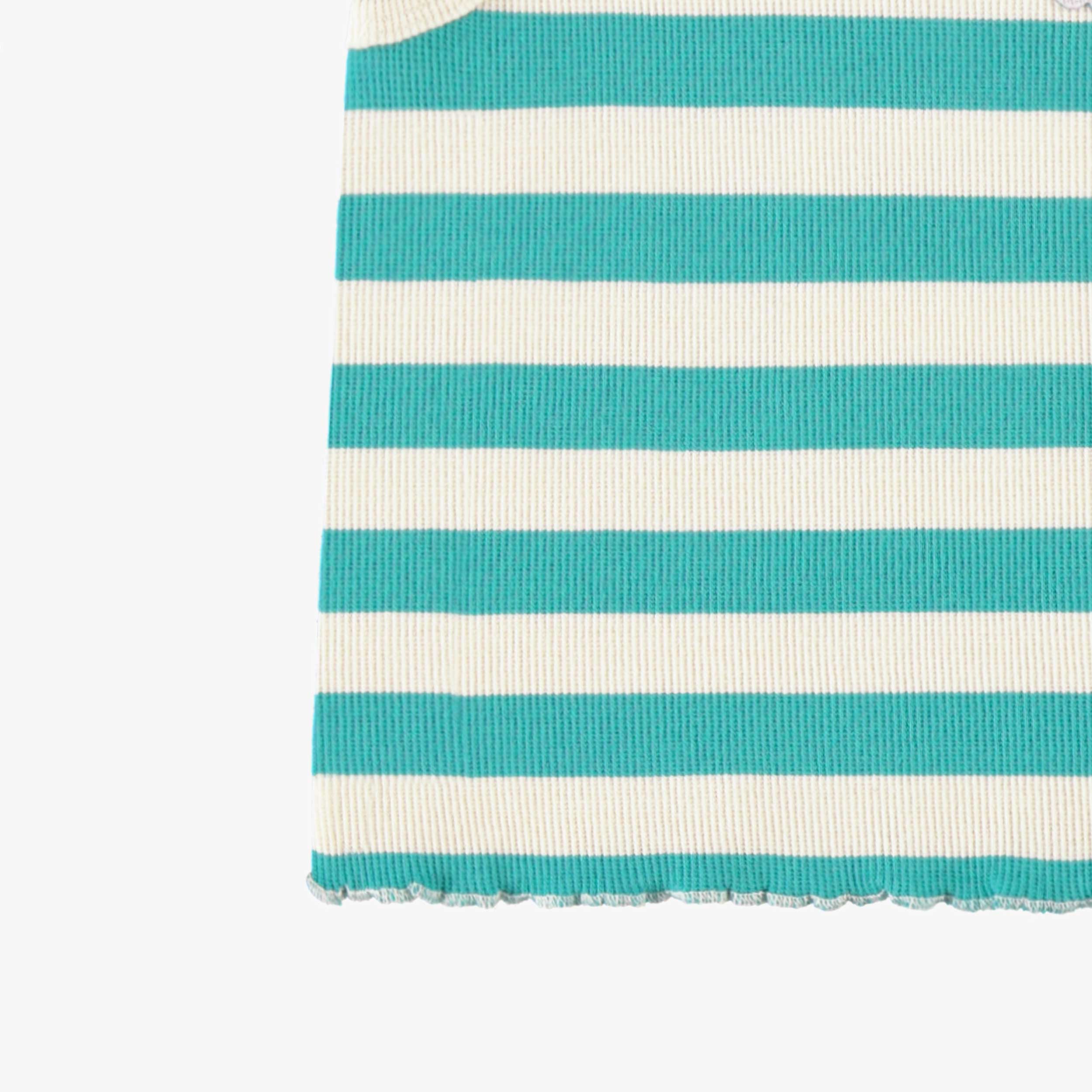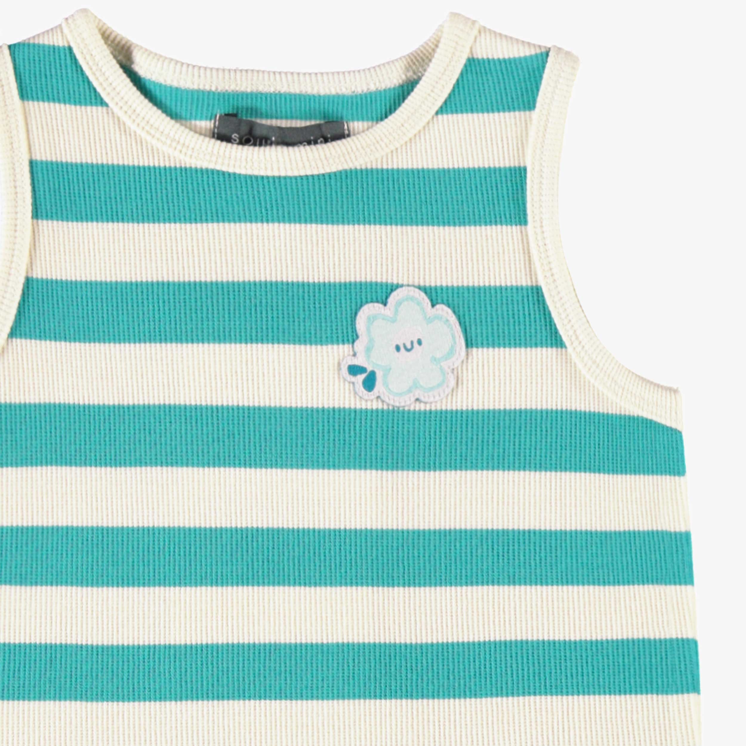 Camisole crème et turquoise avec un mignon écusson de fleur. Comprend un col rond et de larges bretelles. Fabriquée en confortable tricot côtelé dans une coupe décontractée. Un morceau simple et pratique qui s’agence bien avec tout!