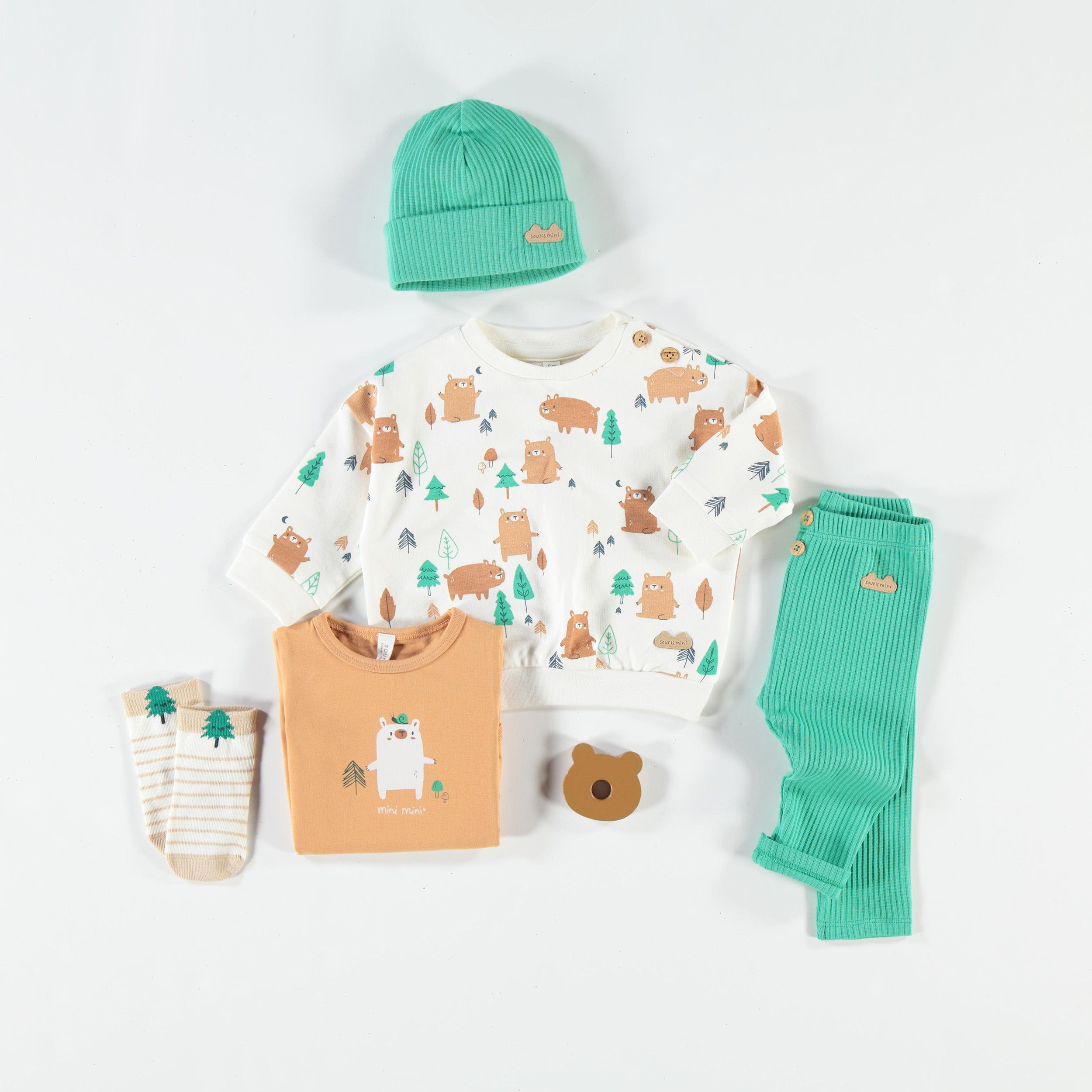 Chandail crème avec des motifs inspirés de la forêt. Le col rond, le bas du chandail et les poignets sont en tricot côtelé pour un meilleur ajustement. On y retrouve deux boutons à l’épaule pour simplifier l’habillement. Coupe décontractée Coton français extensible Tricot côtelé Boutons à l’épaule