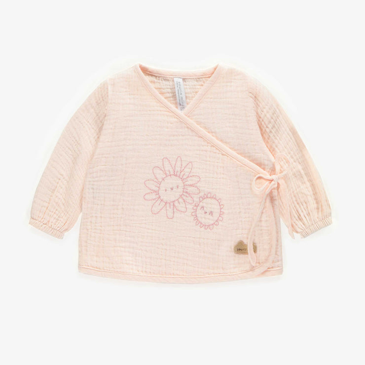 Chandail à manches longues amples rose avec une encolure cach-coeur qui s’attache avec une boucle sur le côté. Fait en mousseline 100% coton.