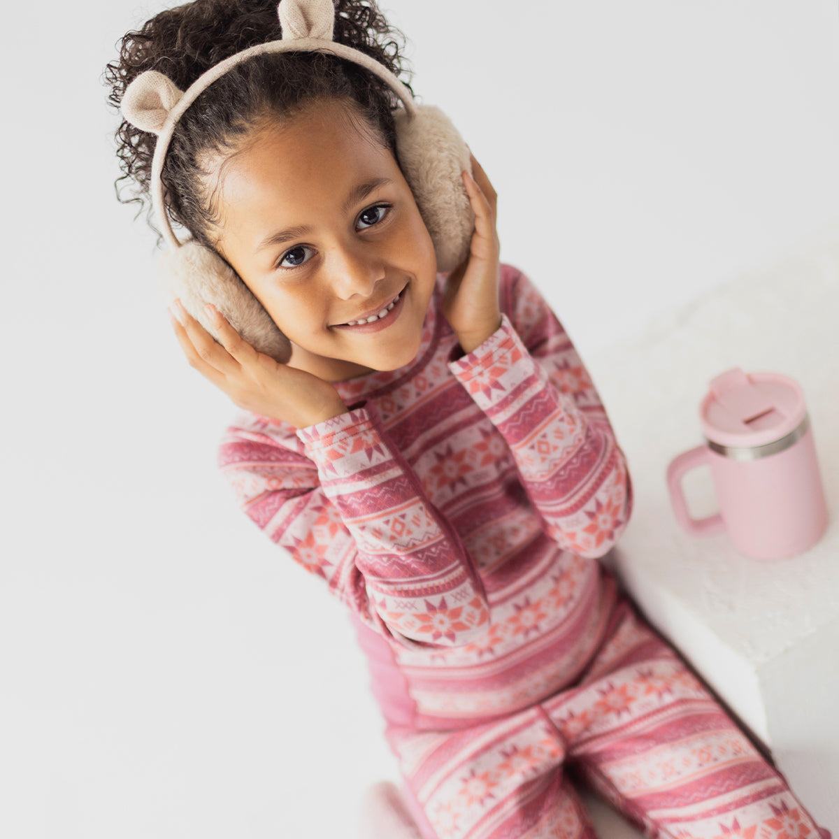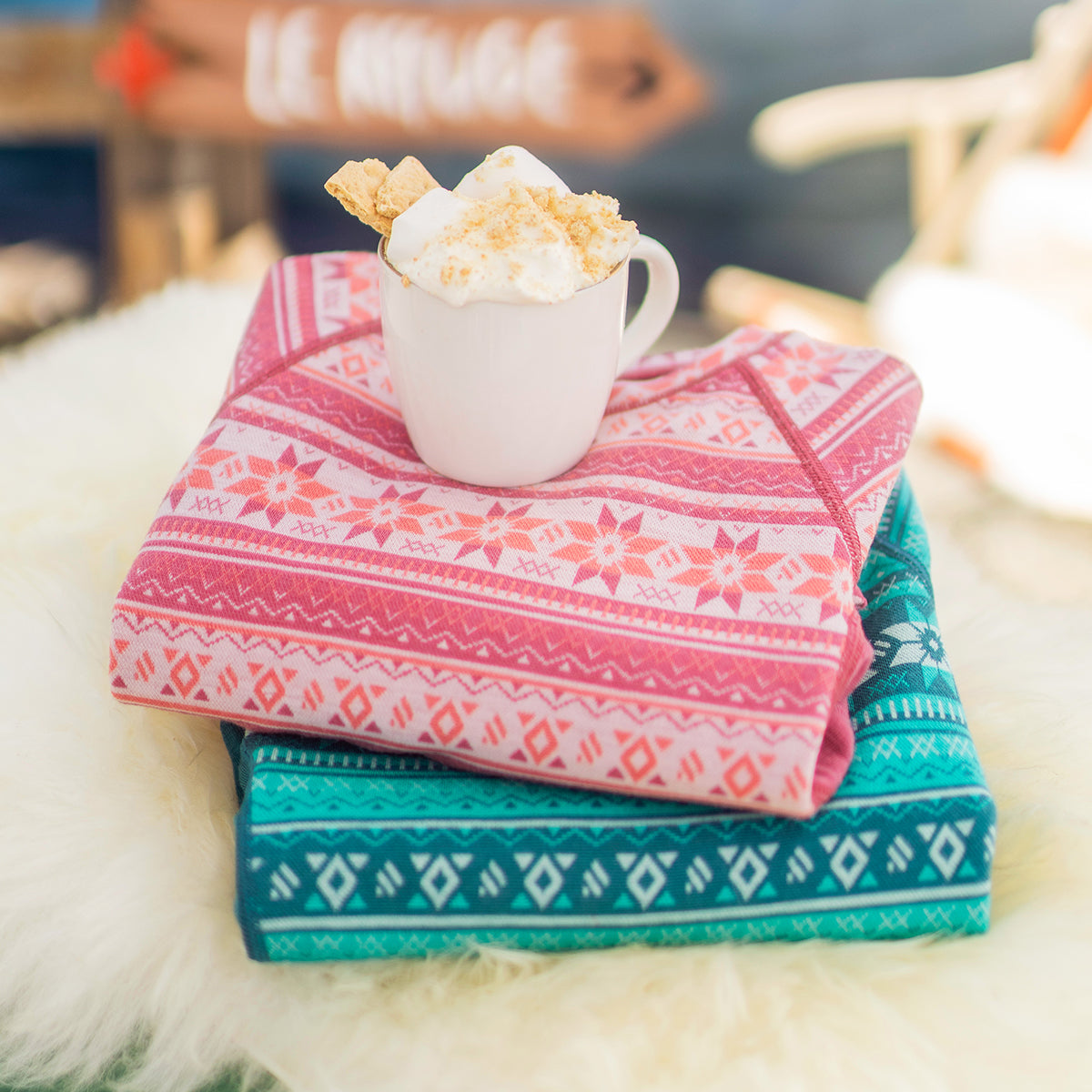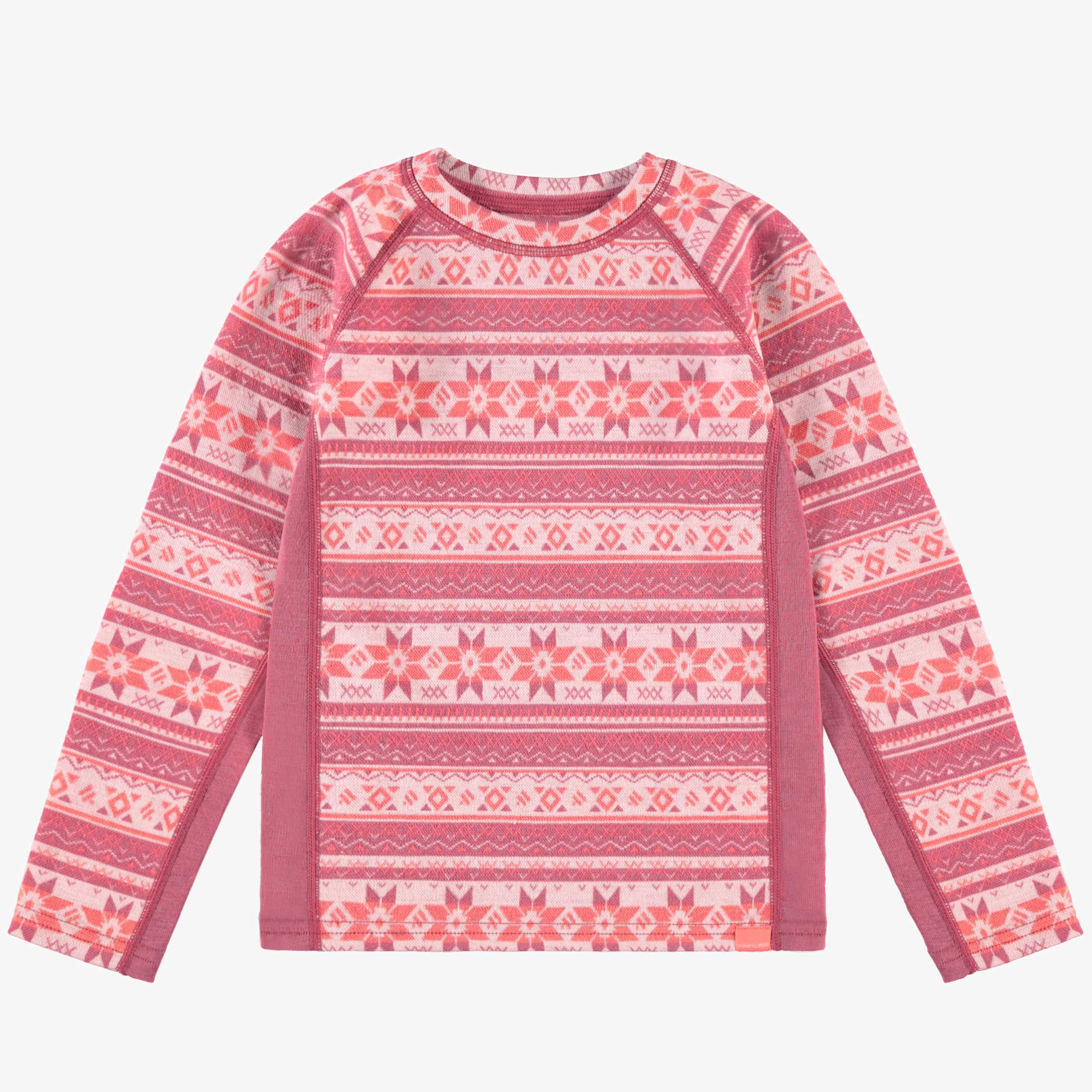 Chandail rose en laine mérinos avec des motifs jacquard pour un beau look hivernal. On y retrouve un col rond et des manches longues. La laine mérinos est une fibre naturelle qui repousse l’humidité, garde au chaud et empêche la formation de bactéries qui causent les mauvaises odeurs. C’est le chandail parfait pour les enfants actifs, à porter sous un habit de neige pour un maximum de chaleur. À agencer avec le legging assorti.