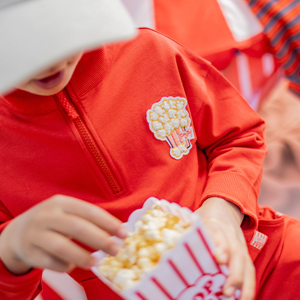 Chandail rouge avec zip ¼, fabriqué en confortable coton français. Comprend des manches longues, une poche kangourou et des écussons amusants de popcorn. Le bas du chandail ainsi que les poignets sont en tricot côtelé pour un meilleur ajustement. Coton français Coupe décontractée Zip ¼ Écussons Poche kangourou