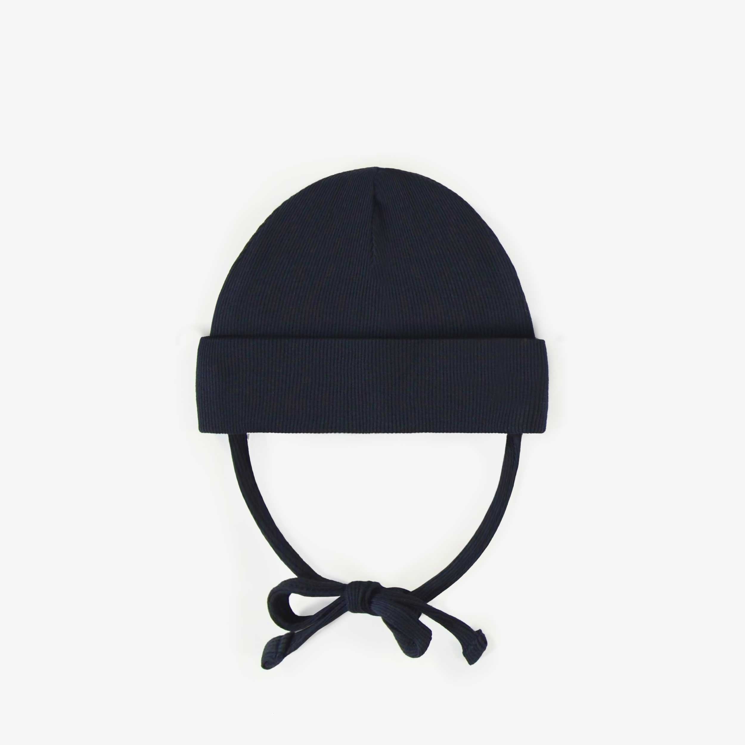 Chapeau marine d’extérieur avec cordons en tricot côtelé, naissance