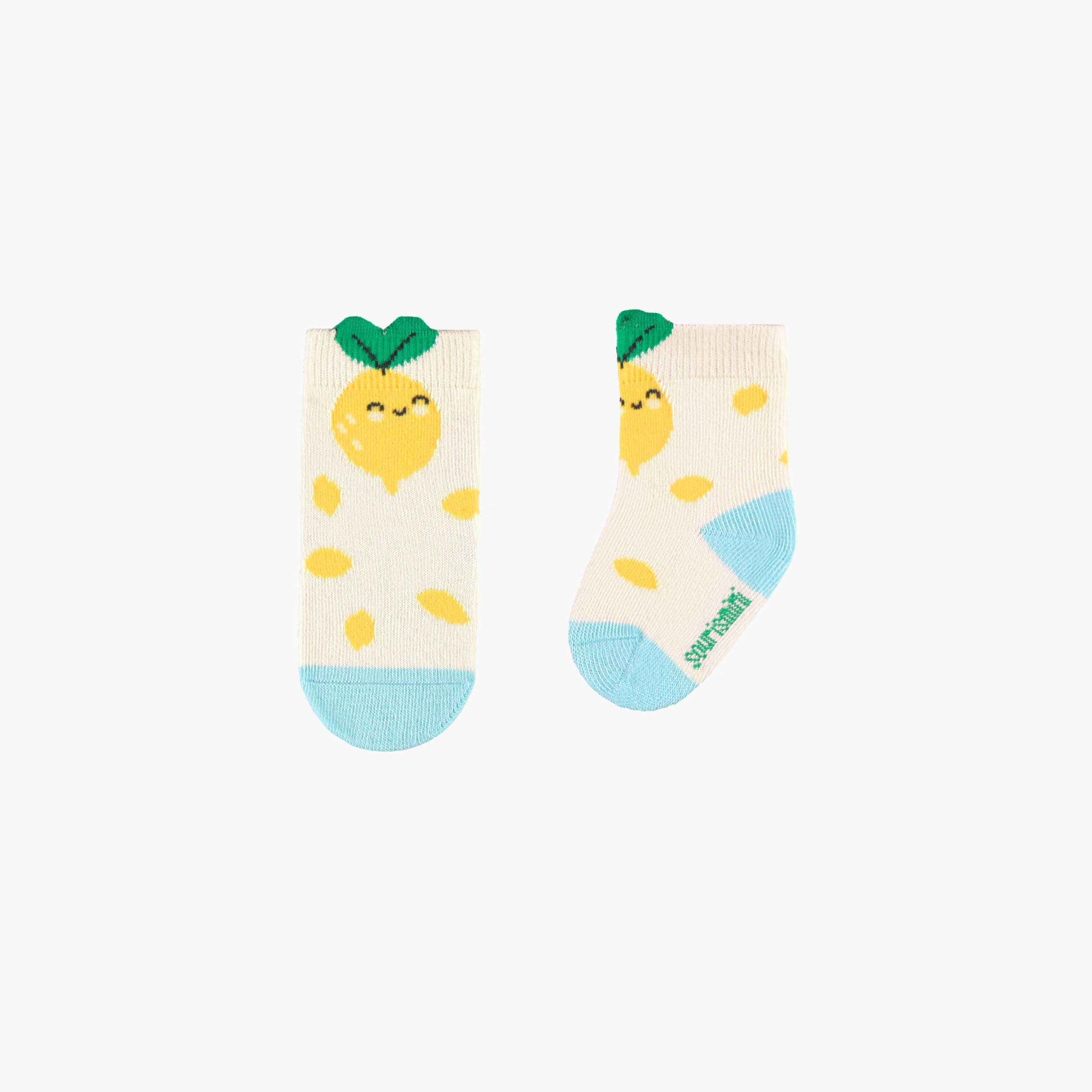 Chaussettes crème avec des mignons motifs de citrons, fabriquées dans un confortable tissu extensible. On adore la touche de turquoise sur les talons et les orteils.