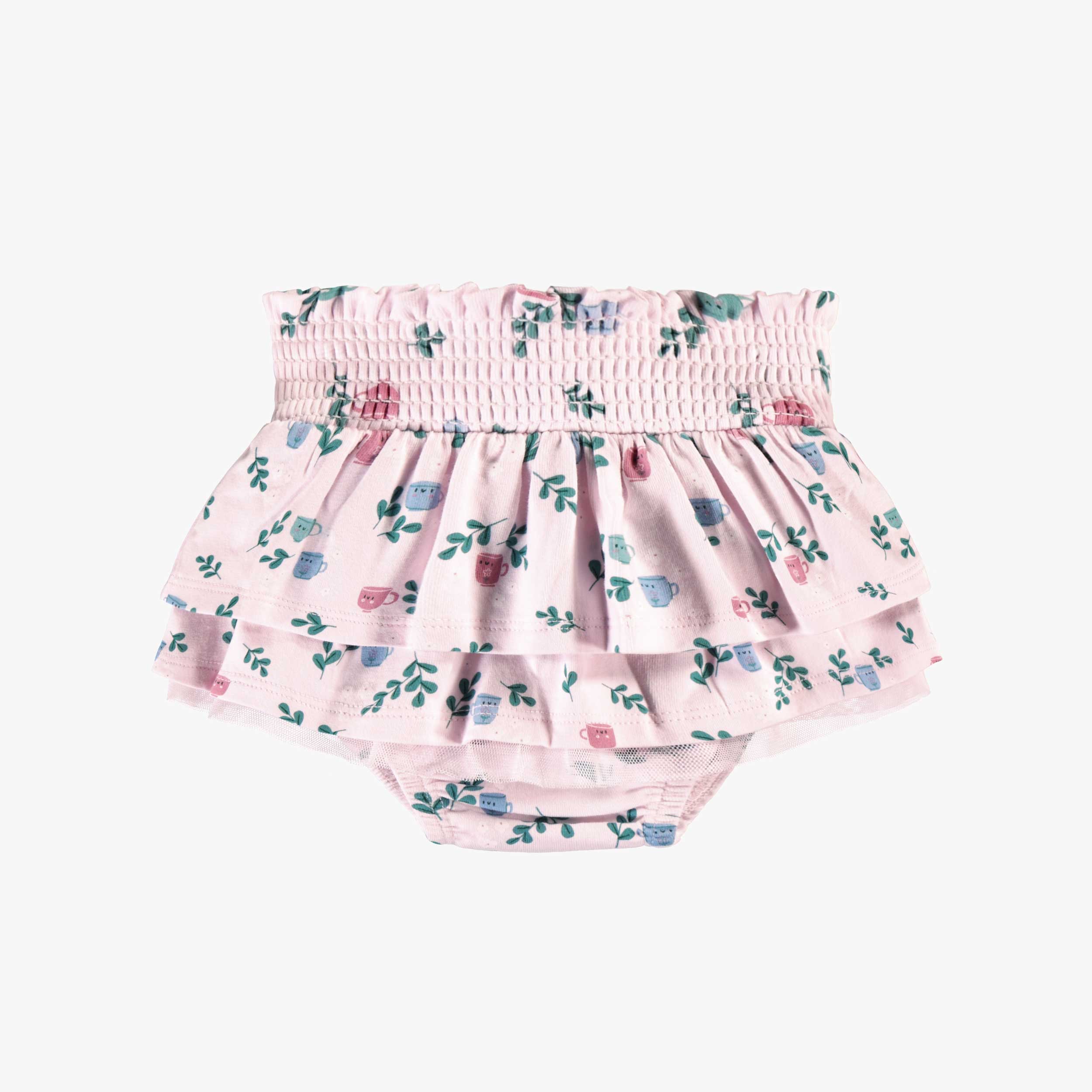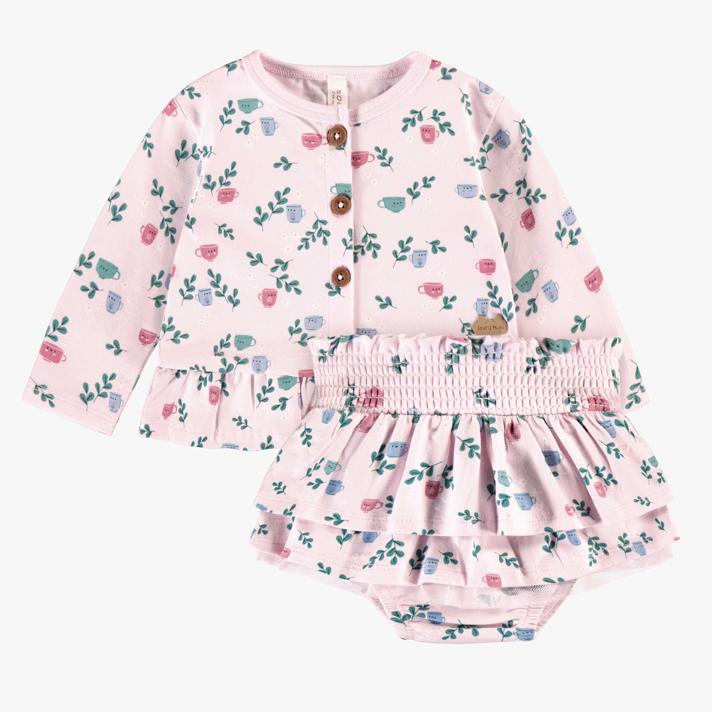 Ensemble deux-pièces rose avec une veste à manches longues avec volants à la taille et une boutonnière imitation de bois à l’avant. Accompagné d’un short de coupe ample style bloomer à larges volants étagés dont deux en tulle, à taille élastique en nid d’abeille et à cuisses élastiques. Le tout dans un motif répété imprimé de tasses souriantes prêtes pour l'heure du thé et de fleurs dans des teintes douces de bleu, de turquoise, de blanc et de rose fabriqué en jersey extensible.Un ensemble magnifique pensé pour ne pas se casser la tête à trouver une tenue parfaite, que ce soit une tenue de détente ou de sortie, elle fait pour toutes occasions!-Jersey extensible -Volants -Taille et cuisses élastiques-Motif répété