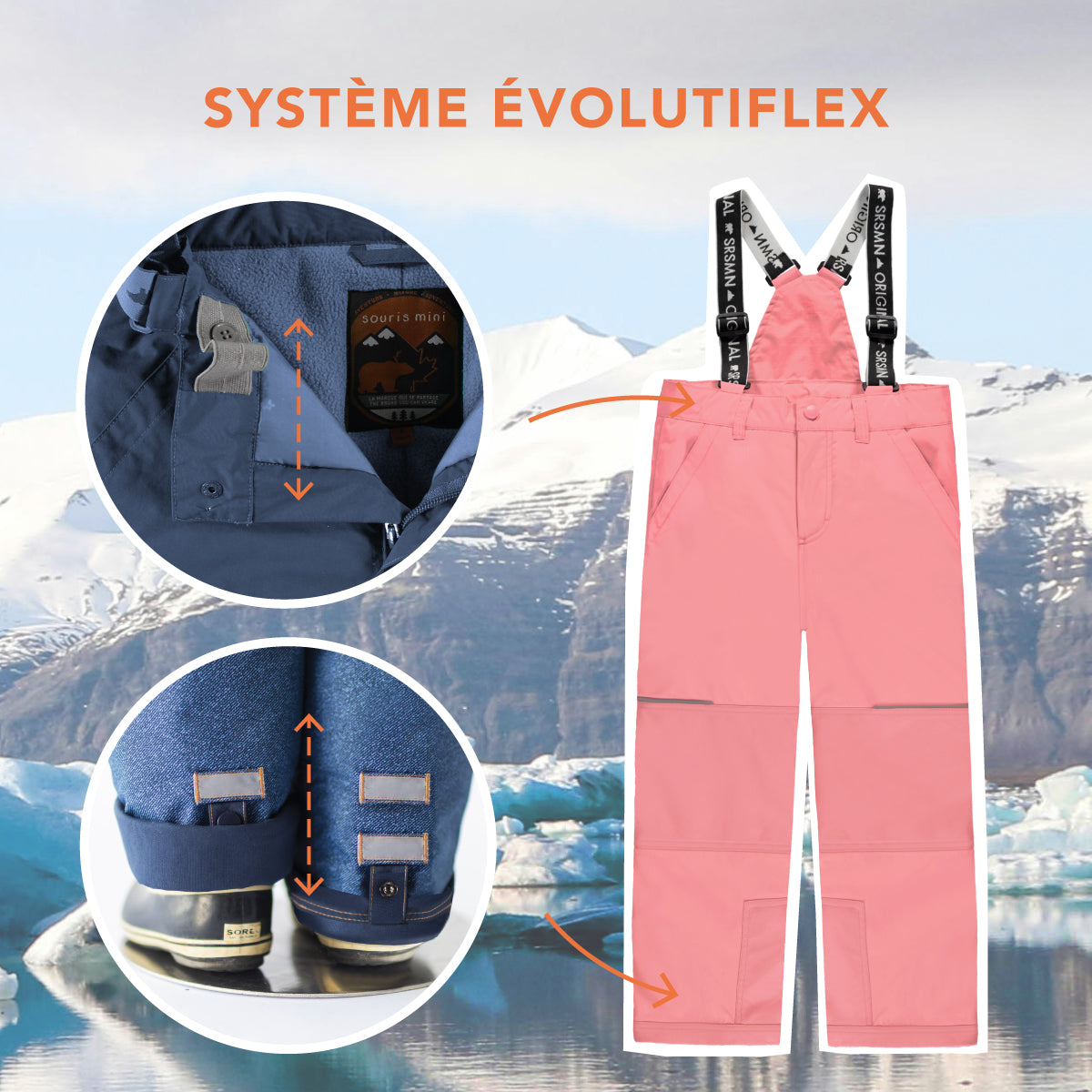 Avec notre système EVOLUTIFLEX, vos habits de neige seront portés plus longtemps! Les manches, les jambes et la taille offrent plusieurs ajustements.